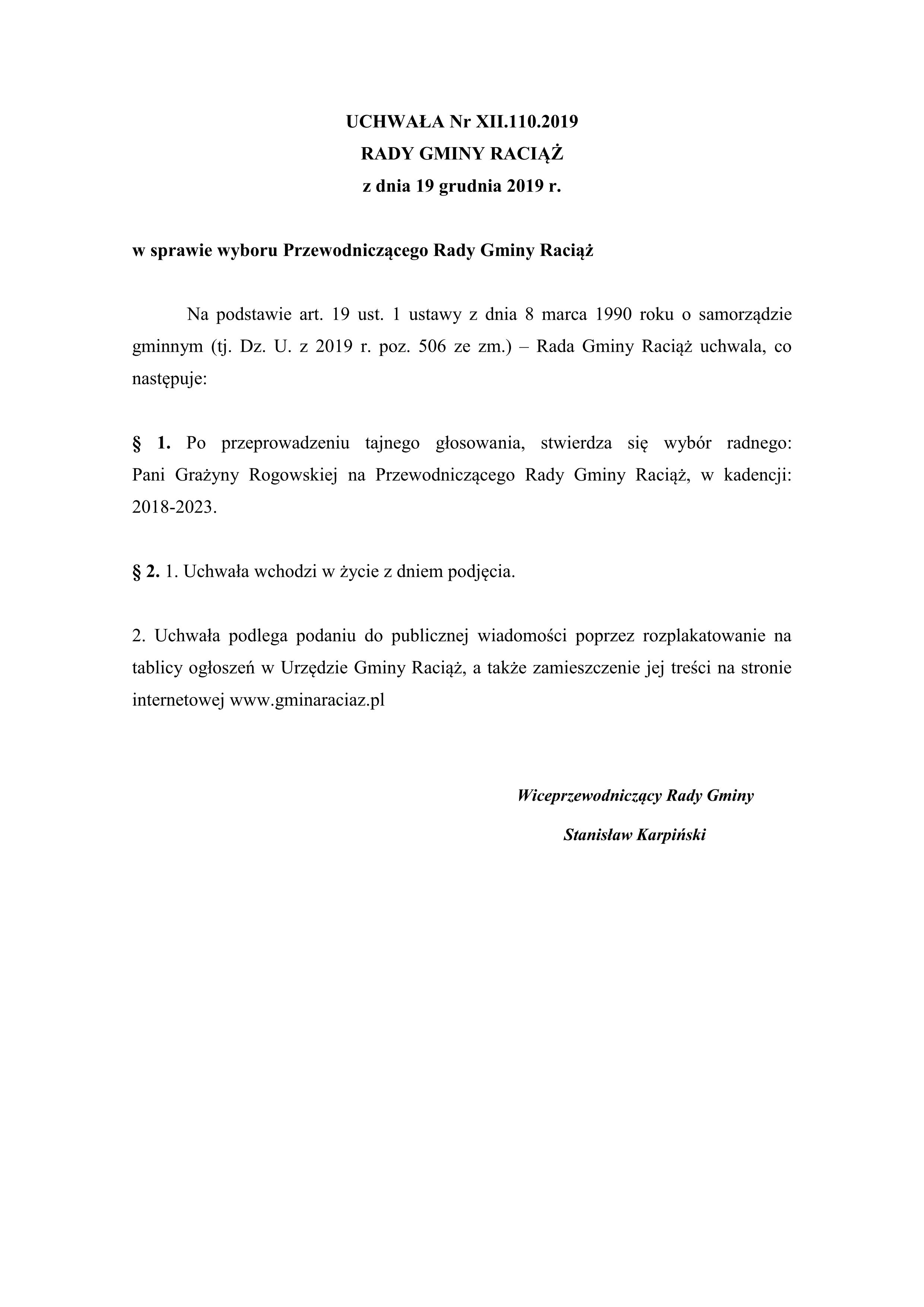 UCHWAŁA Nr XII.110.2019 RADY GMINY RACIĄŻ z dnia 19 grudnia 2019r.