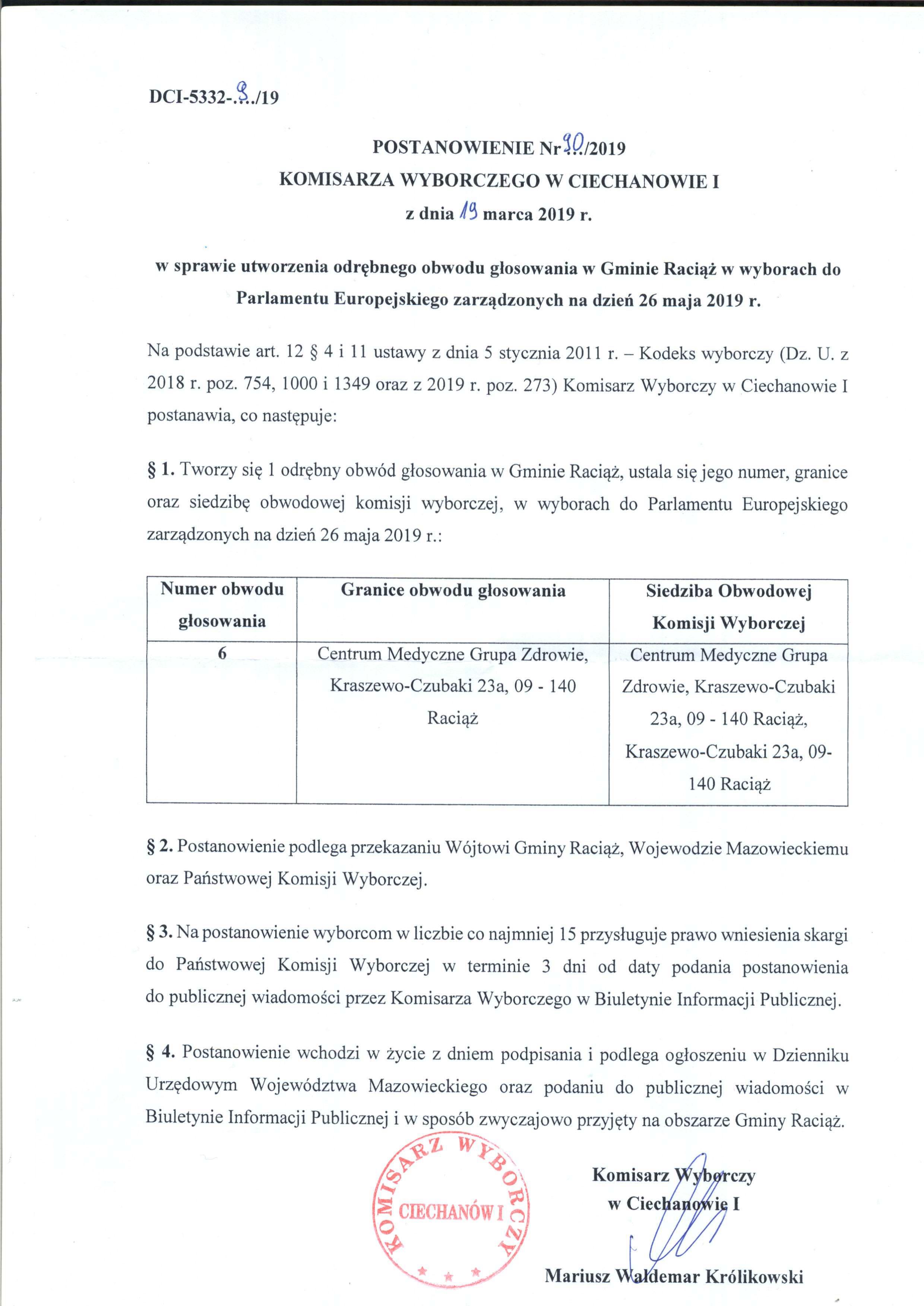 Postanowienie Nr 90/2019 Komisarza Wyborczego w Ciechanowie z dnia 19 marca 2019 r.