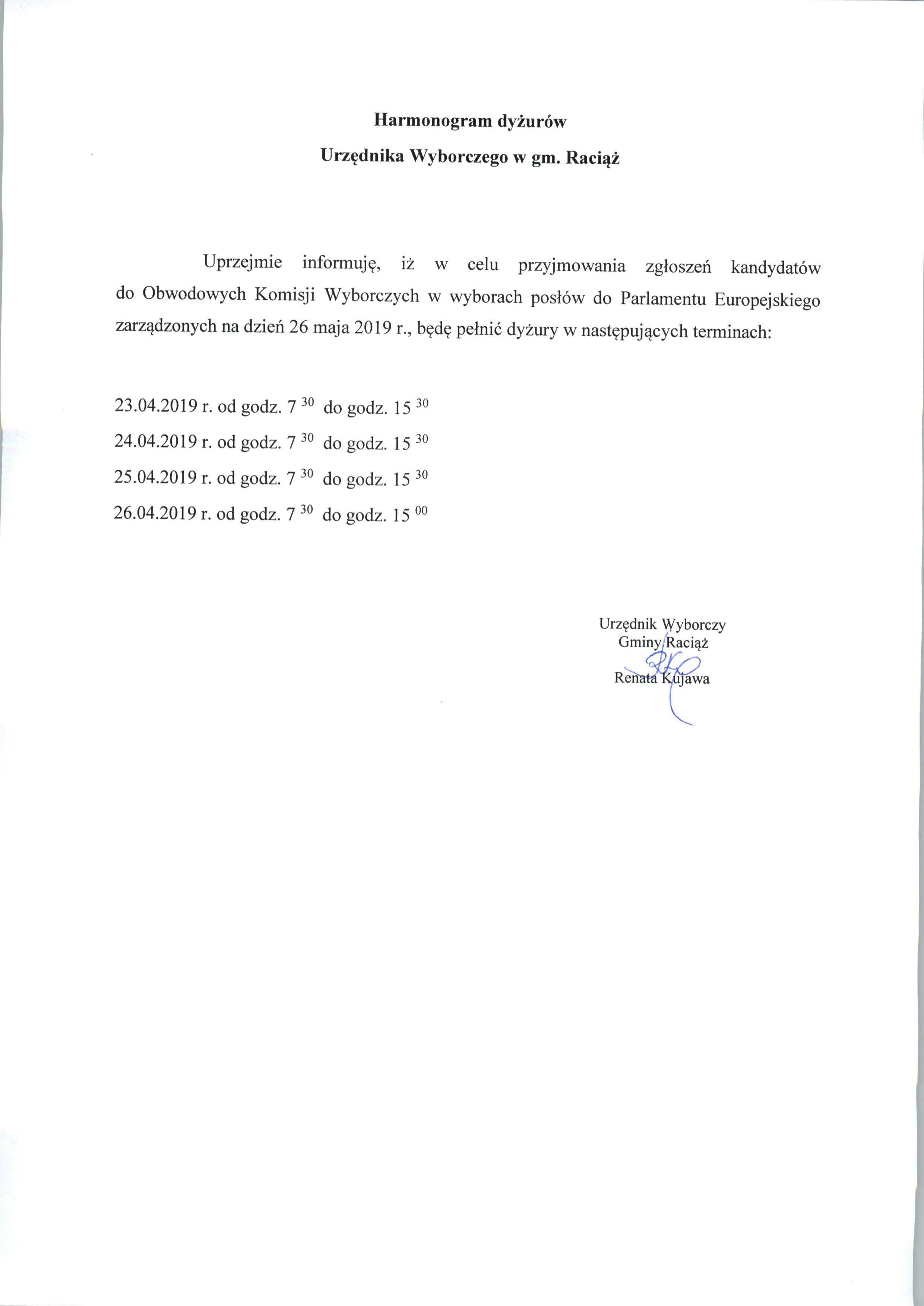 Informacja o dyżurach pełnionych przez urzędnika wyborczego Gminy Raciąż