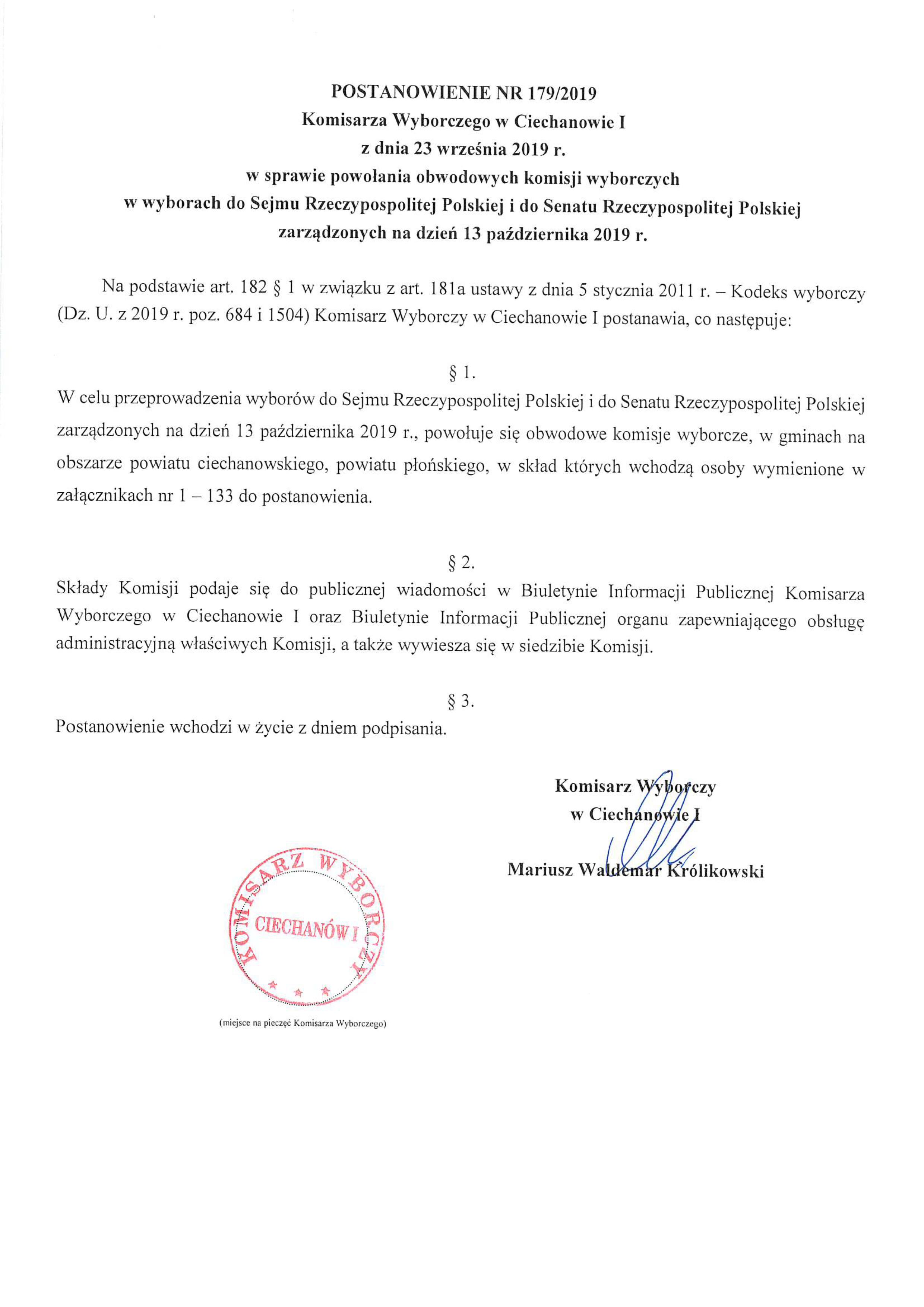 Postanowienie nr 179/2019 Komisarza Wyborczego w Ciechanowie I z dnia 23 września 2019 r. w sprawie powołania obwodowych komisji wyborczych