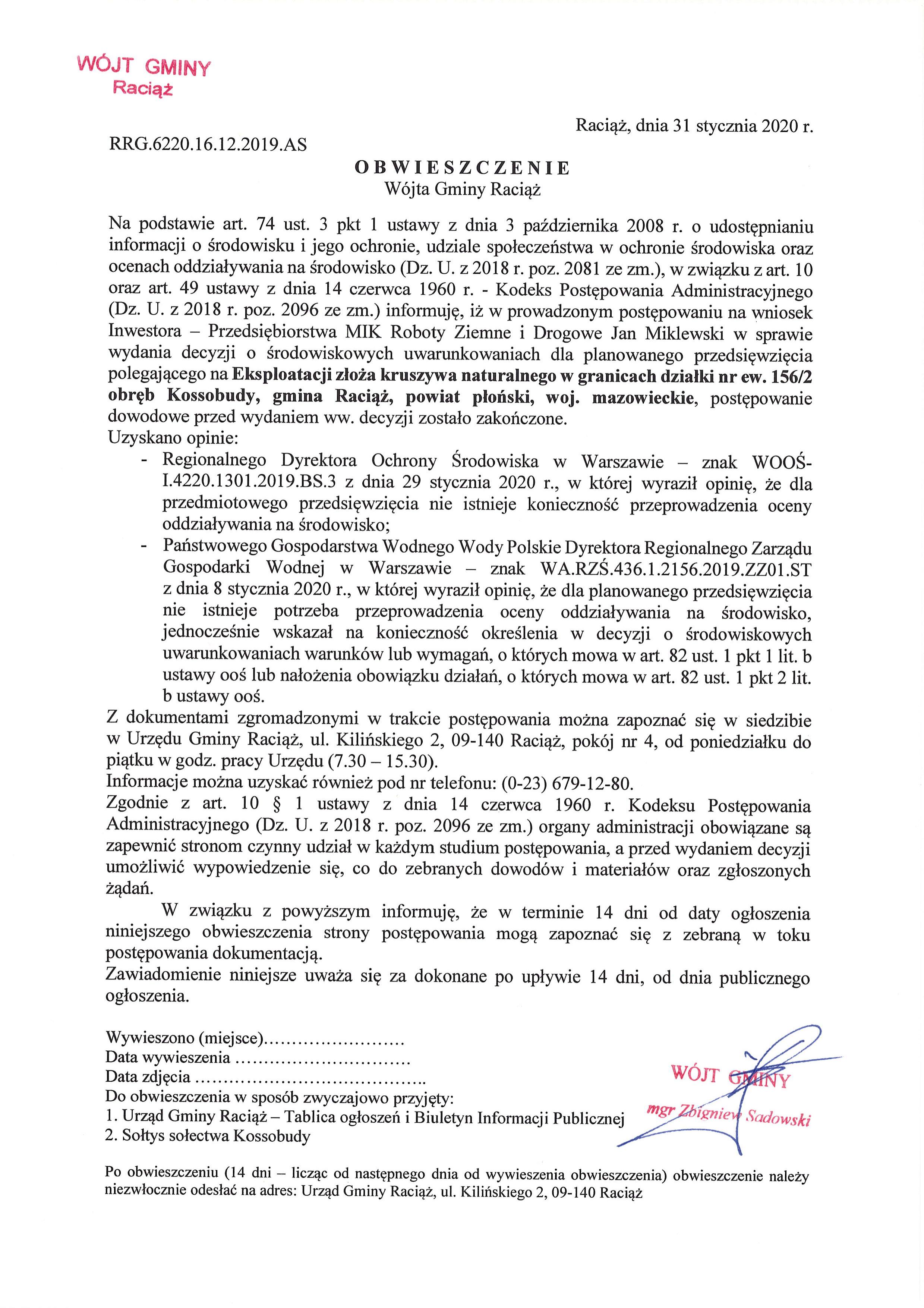 Eksploatacja złoża kruszywa naturalnego w granicach działki nr ew. 156/2 obręb Kossobudy, gmina Raciąż, powiat płoński, woj. mazowieckie