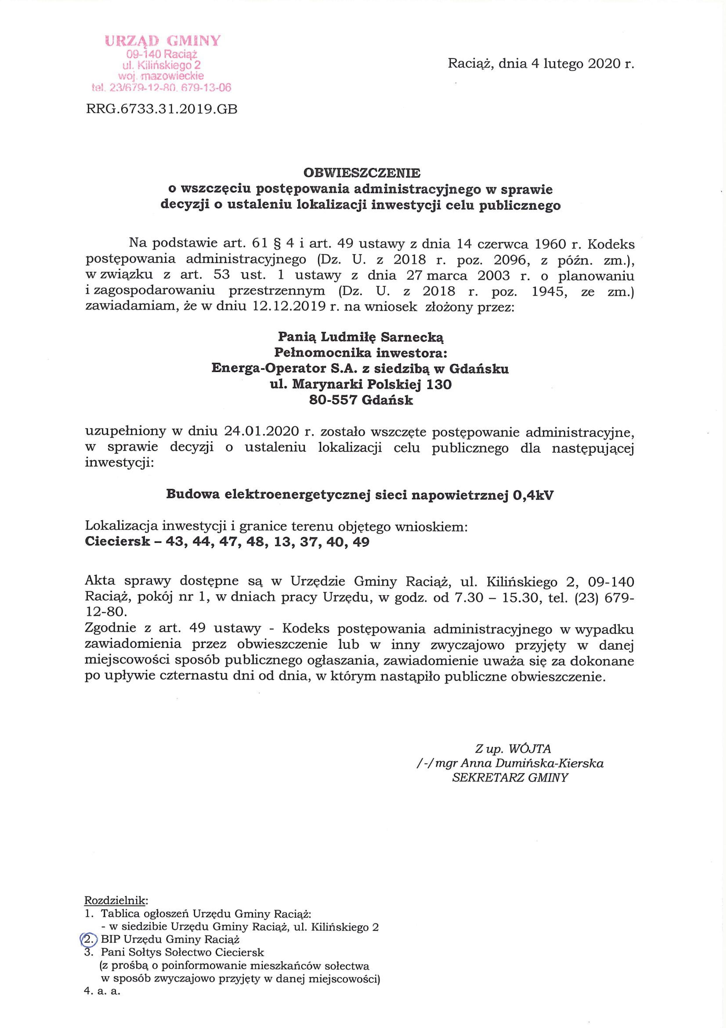 Obwieszczenie o wszczęciu postępowania- cel publiczny-budowa elektroenergetycznej sieci napowietrznej 04 kV Cieciersk