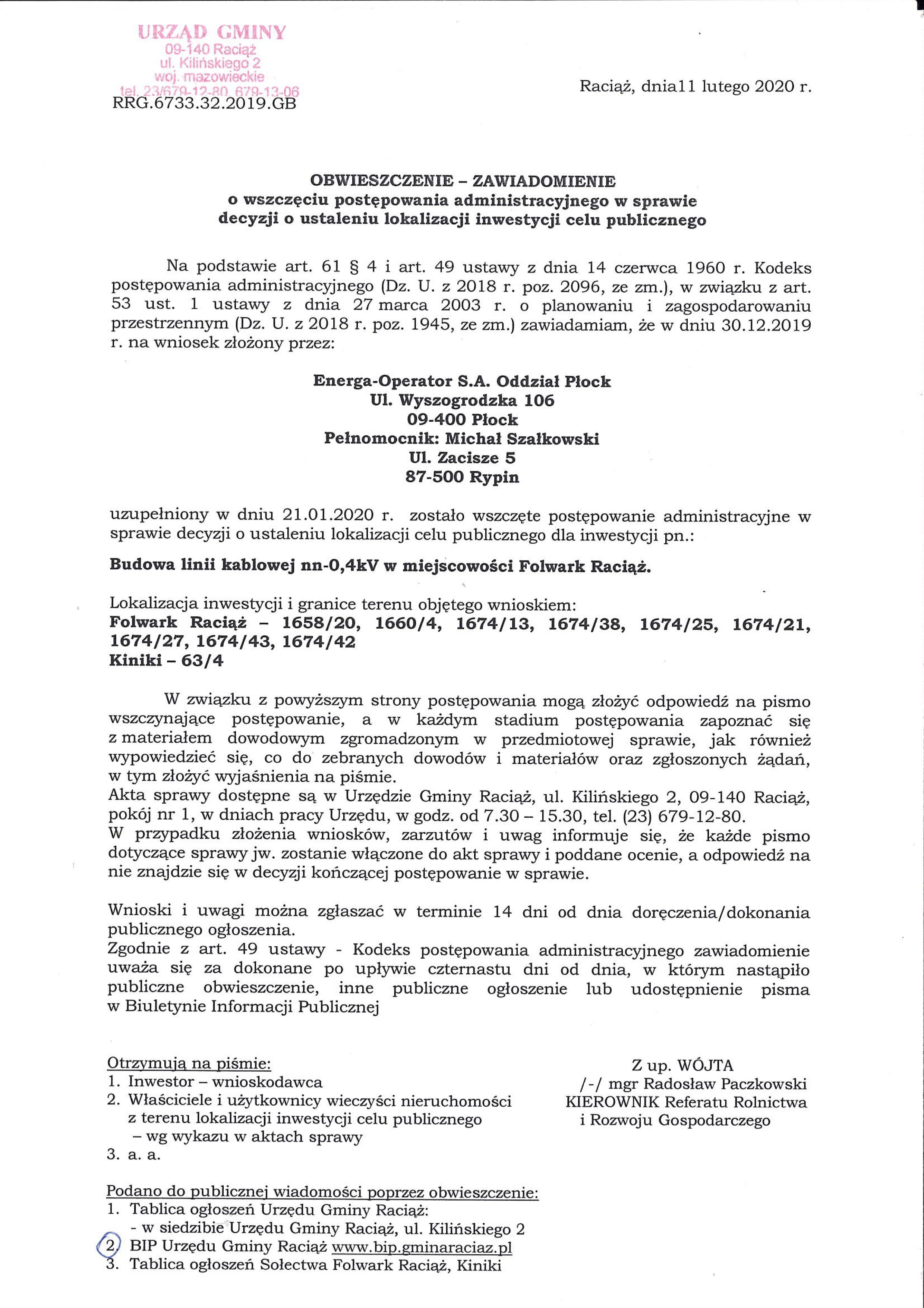 Obwieszczenie o wszczęciu postępowania- cel publiczny-budowa linii kablowej nn 0,4 kV w m. Folwark – Raciąż