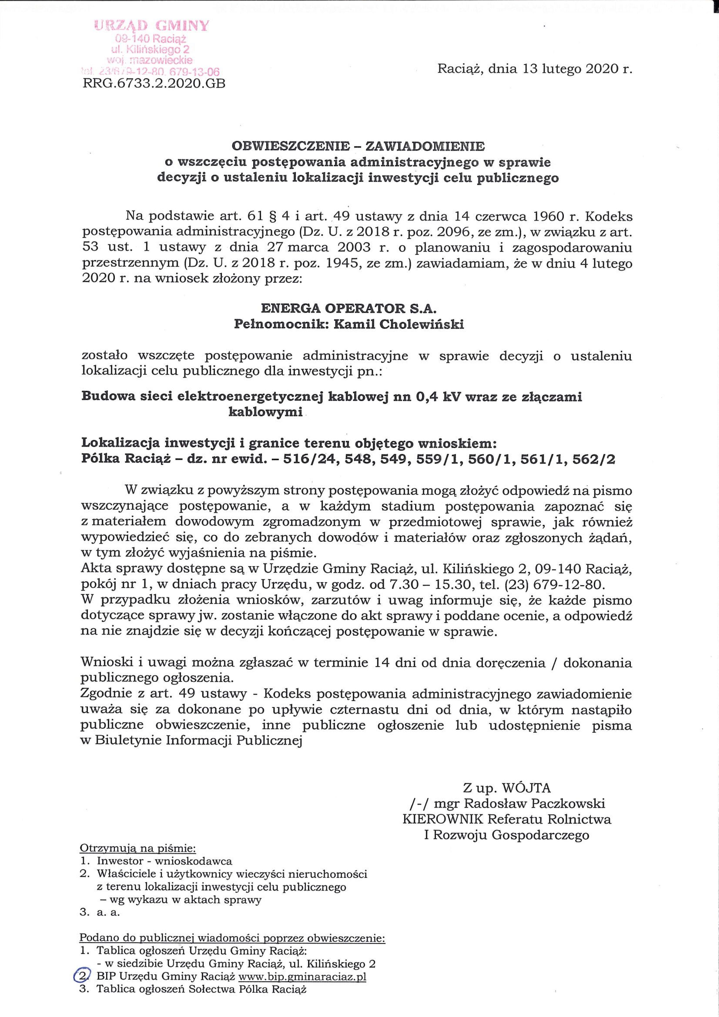 Obwieszczenie o wszczęciu postępowania-cel publiczny-budowa sieci elektroenergetycznej kablowej nn 0,4 kV wraz ze złączami kablowymi w miejscowości Pólka Raciąż