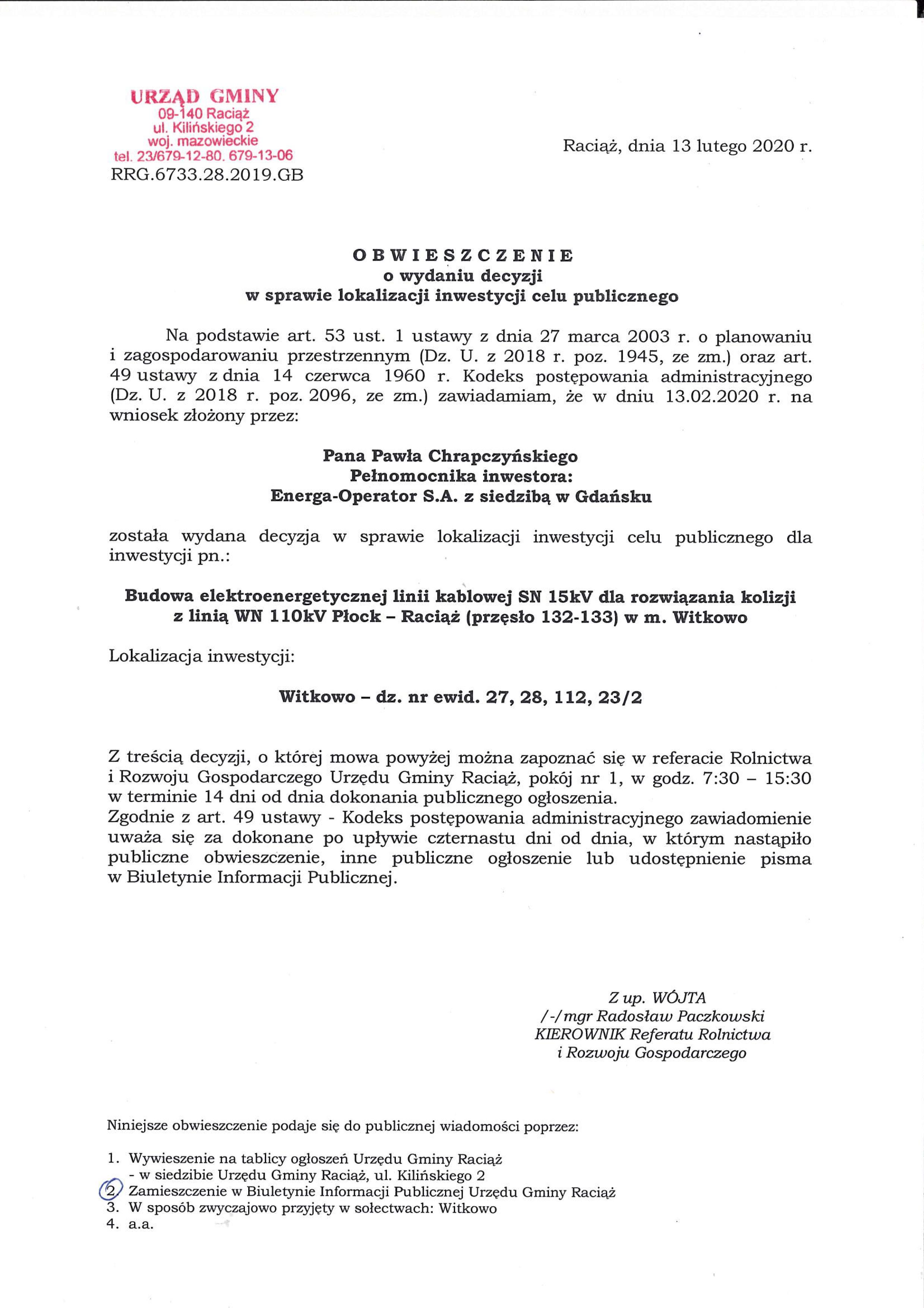 Obwieszczenie o wydaniu decyzji-cel publiczny-Budowa elektroenergetycznej linii kablowej SN 15kV dla rozwiązania kolizji z linią WN 110kV Płock-Raciąż (przęsło 132-133) w m. Witkowo