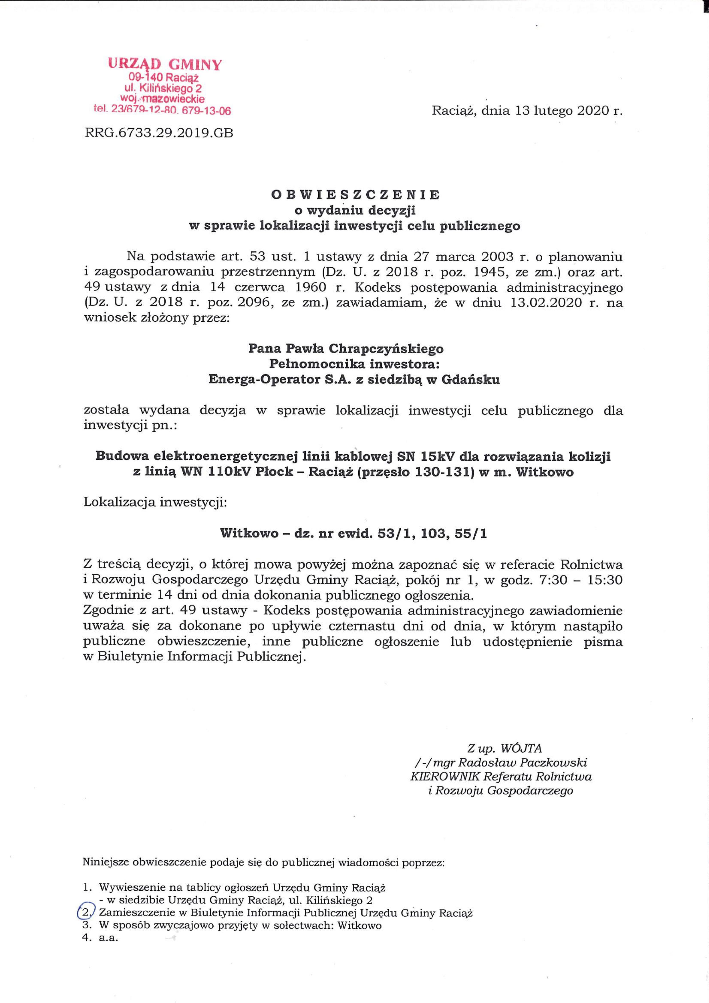 Obwieszczenie o wydaniu decyzji-cel publiczny-Budowa elektroenergetycznej linii kablowej SN 15kV dla rozwiązania kolizji z linią WN 110kV Płock-Raciąż (przęsło 130-131) w m. Witkowo.