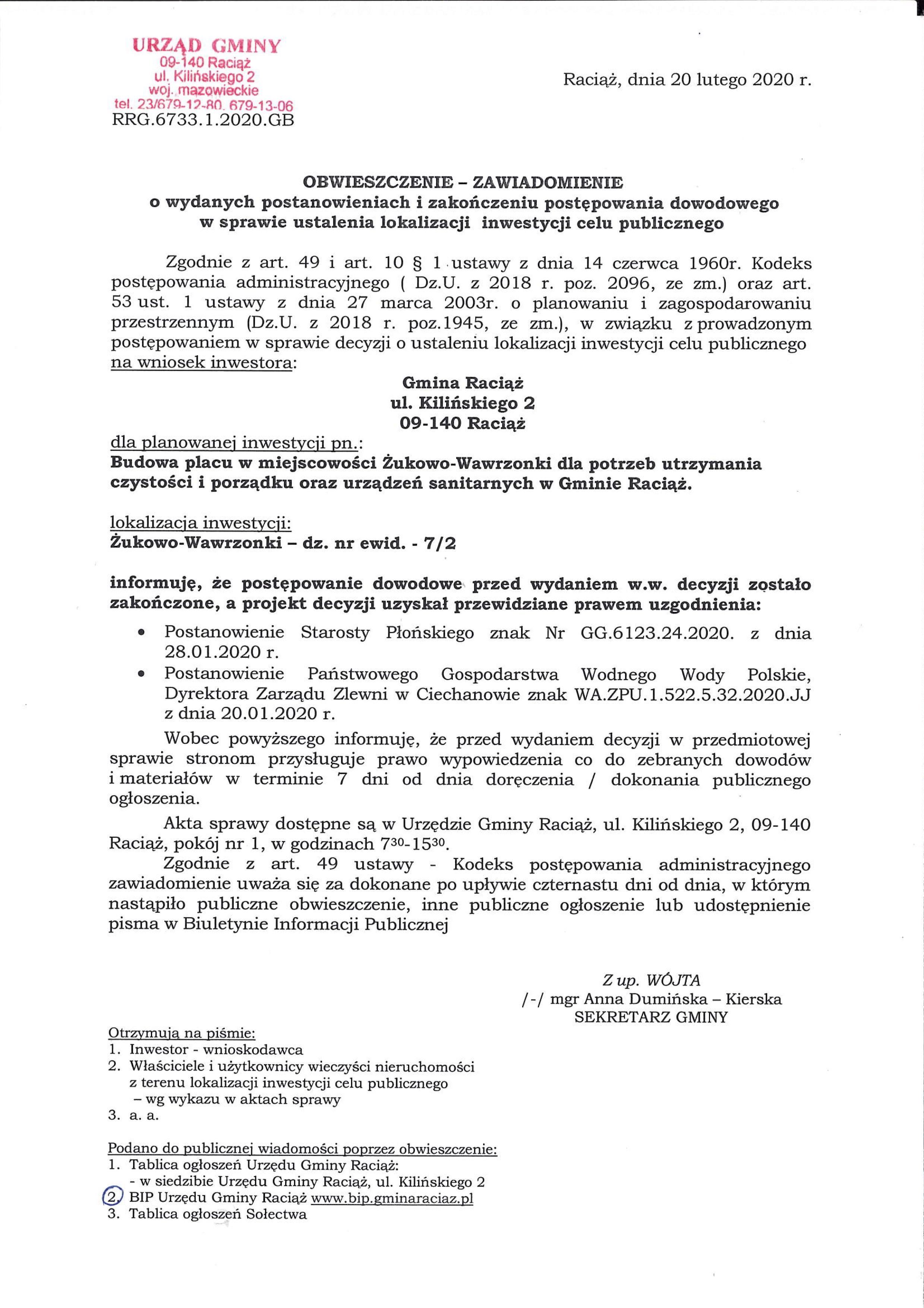 Obwieszczenie-Zawiadomienie-cel publiczny-o wydanych postanowieniach i zakończeniu postępowania-Budowa placu w miejscowości Żukowo-Wawrzonki dla potrzeb utrzymania czystości i porządku oraz urządzeń sanitarnych w Gminie Raciąż.