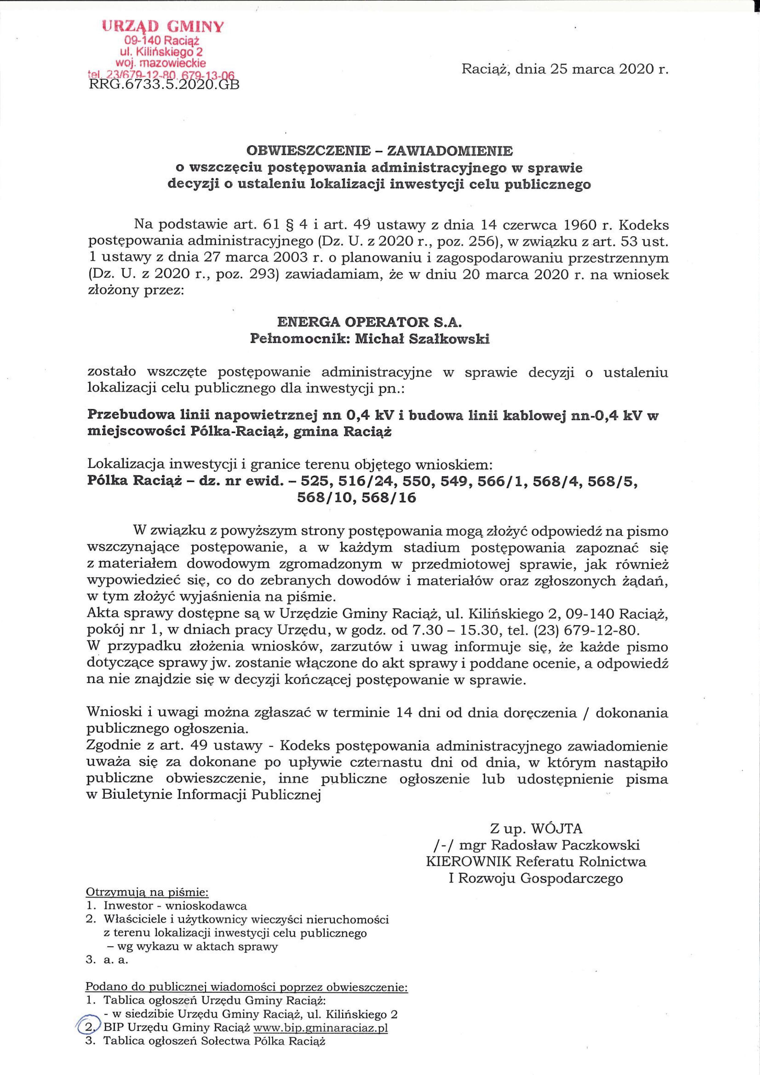5.2020 Cel publiczny – Obwieszczenie o wszczęciu postępowania „Przebudowa linii napowietrznej nn 0,4 kV i budowa linii kablowej nn-0,4kV” na działkach o nr ew. 525, 516/24, 550, 549, 566/1, 568/4, 568/5, 568/10, 568/16 w miejscowości Pólka-Raciąż. - Obwieszczenia 2020 - Bip Gmina Raciąż