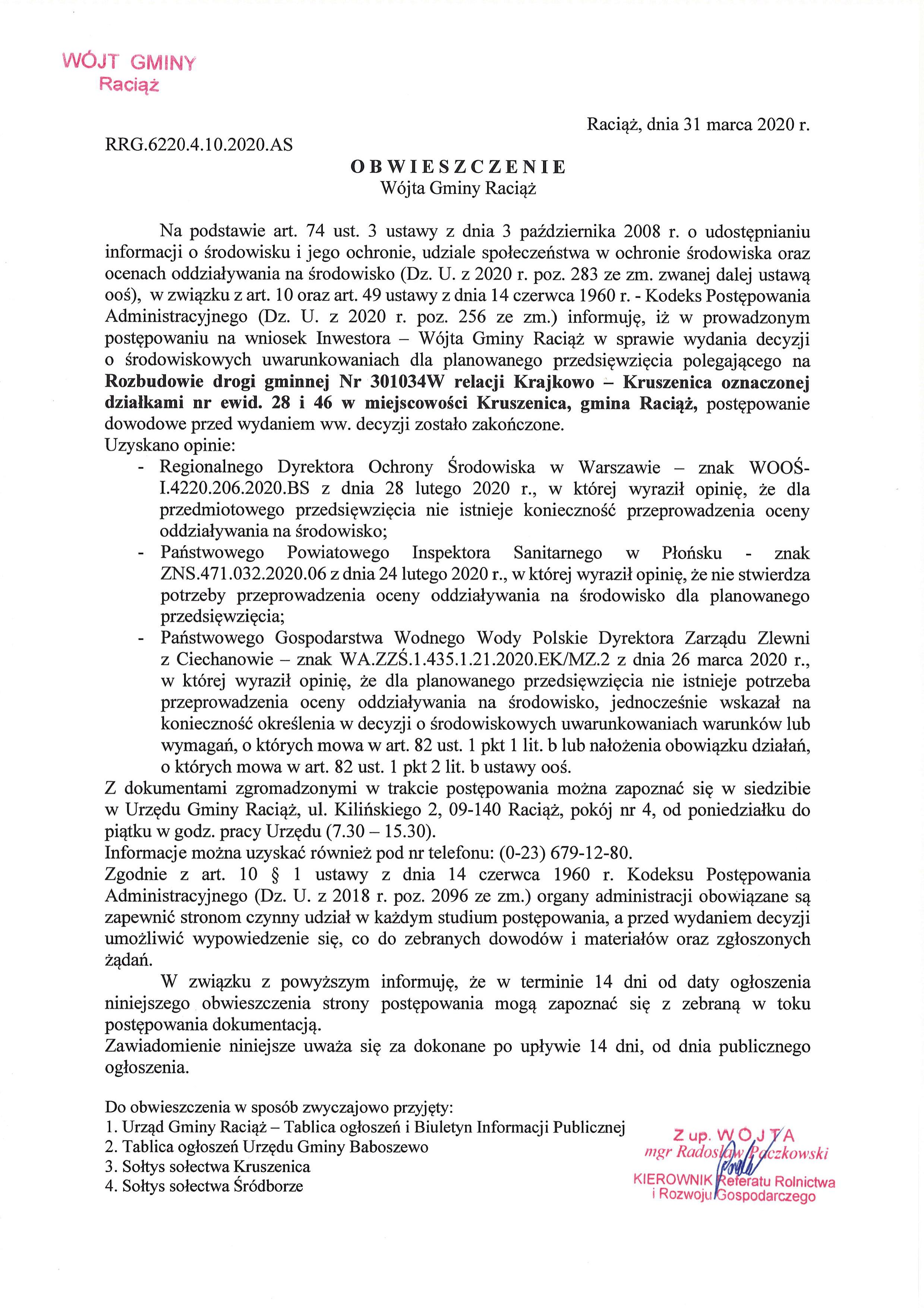 Rozbudowa drogi gminnej Nr 301034W relacji Krajkowo – Kruszenica oznaczonej działkami nr ewid. 28 i 46 w miejscowości Kruszenica, gmina Raciąż