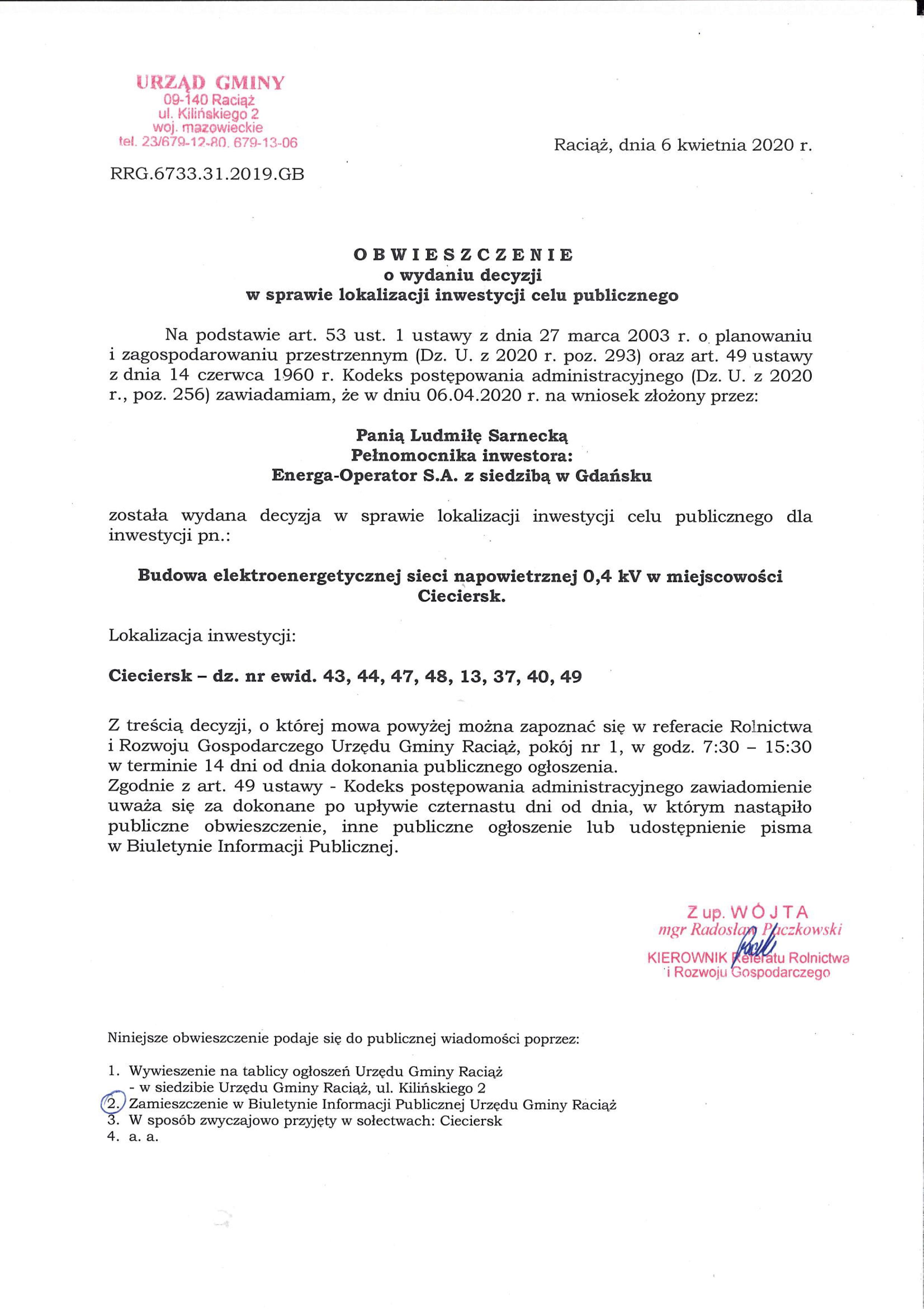 31.2019 – Cel Publiczny – Obwieszczenie o wydaniu decyzji „Budowa elektroenergetycznej sieci napowietrznej 0,4 kV w miejscowości Cieciersk na działkach o nr ew. 43, 44, 47, 48, 13, 37, 40, 49.