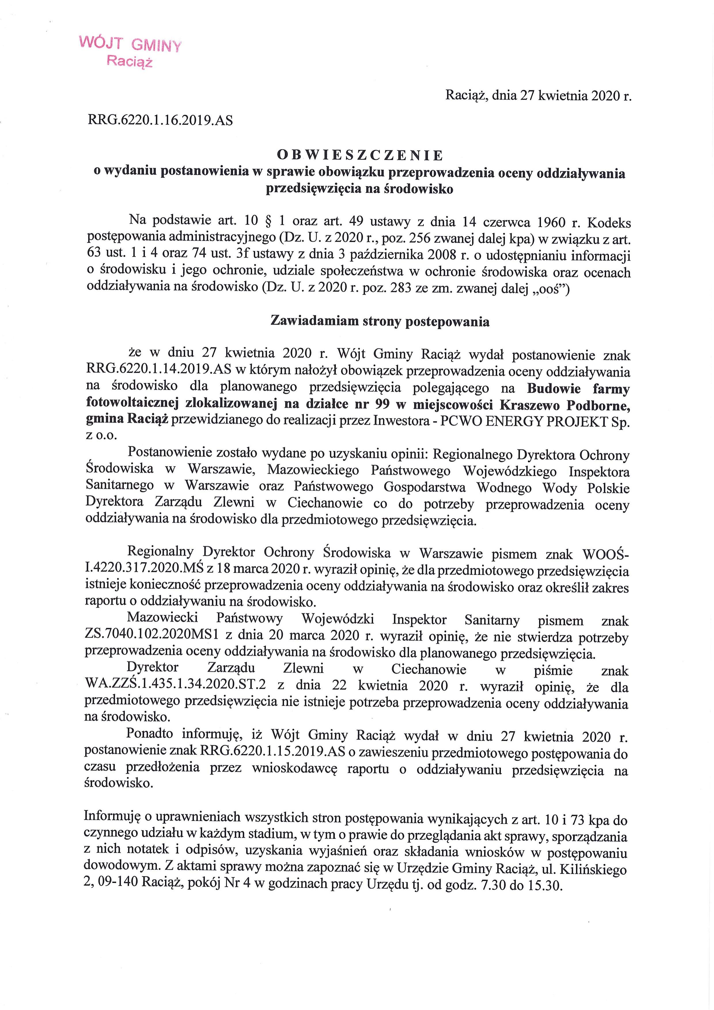 Budowa farmy fotowoltaicznej zlokalizowanej na działce nr 99 w miejscowości Kraszewo Podborne, Gmina Raciąż.