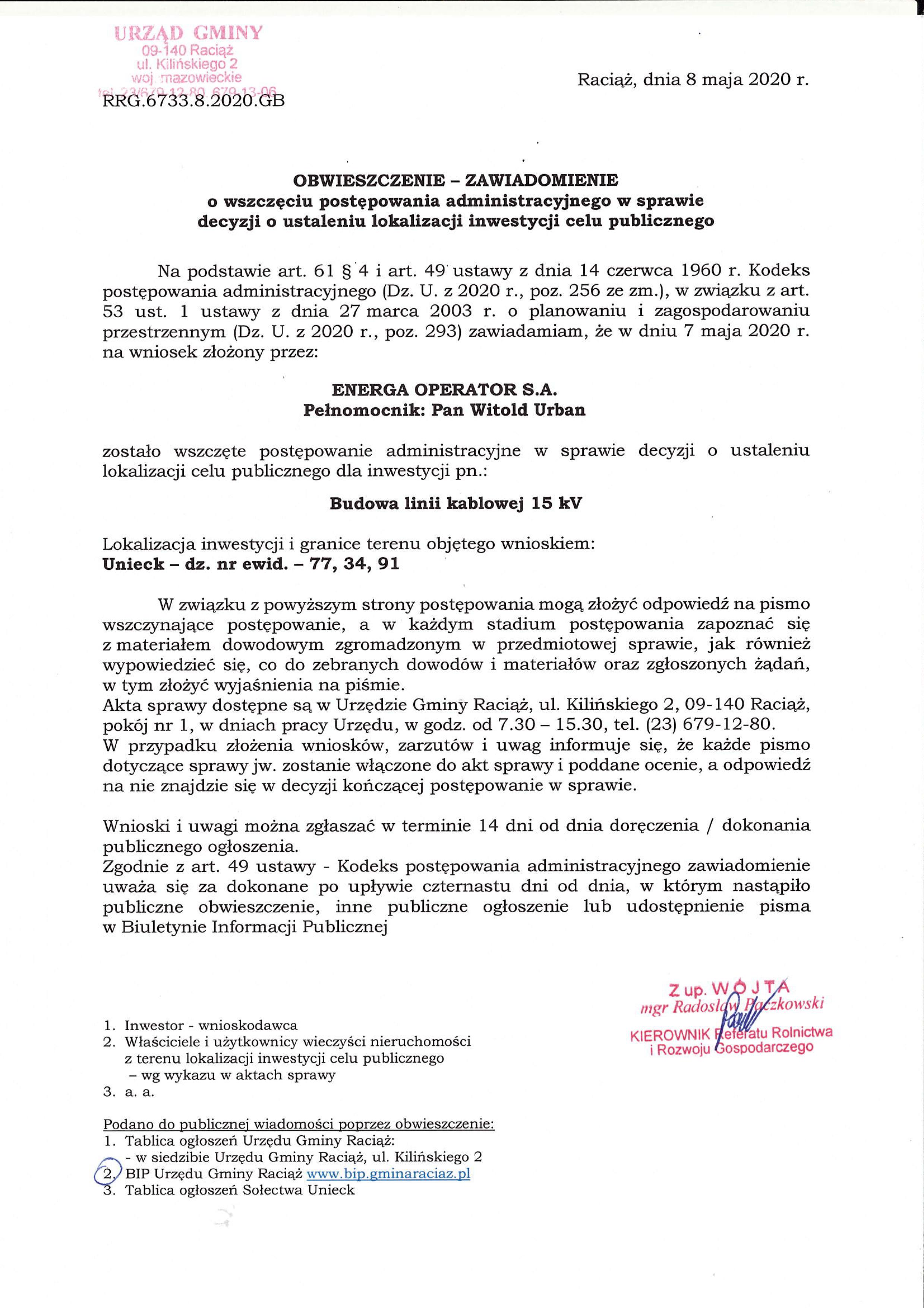 8.2020 – Cel Publiczny – Obwieszczenie o wszczęciu postępowania „ Budowa linii kablowej 15 kV” na działkach o nr ewid. 77, 34, 91 w miejscowości Unieck