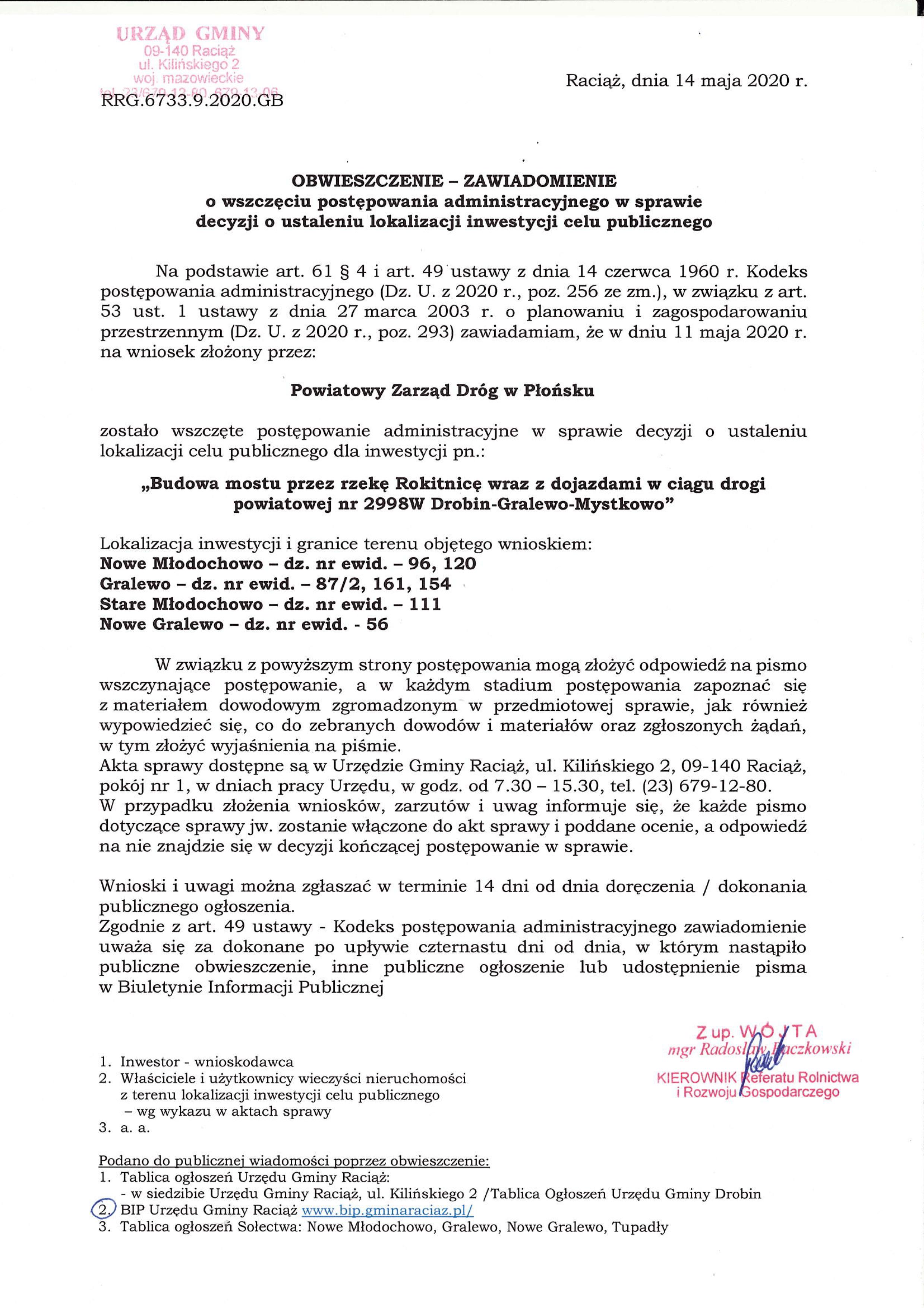 9.2020 Cel Publiczny – Obwieszczenie o wszczęciu postępowania „Budowa mostu przez rzekę Rokitnicę wraz z dojazdami w ciągu drogi powiatowej nr 2998W Drobin-Gralewo-Mystkowo”