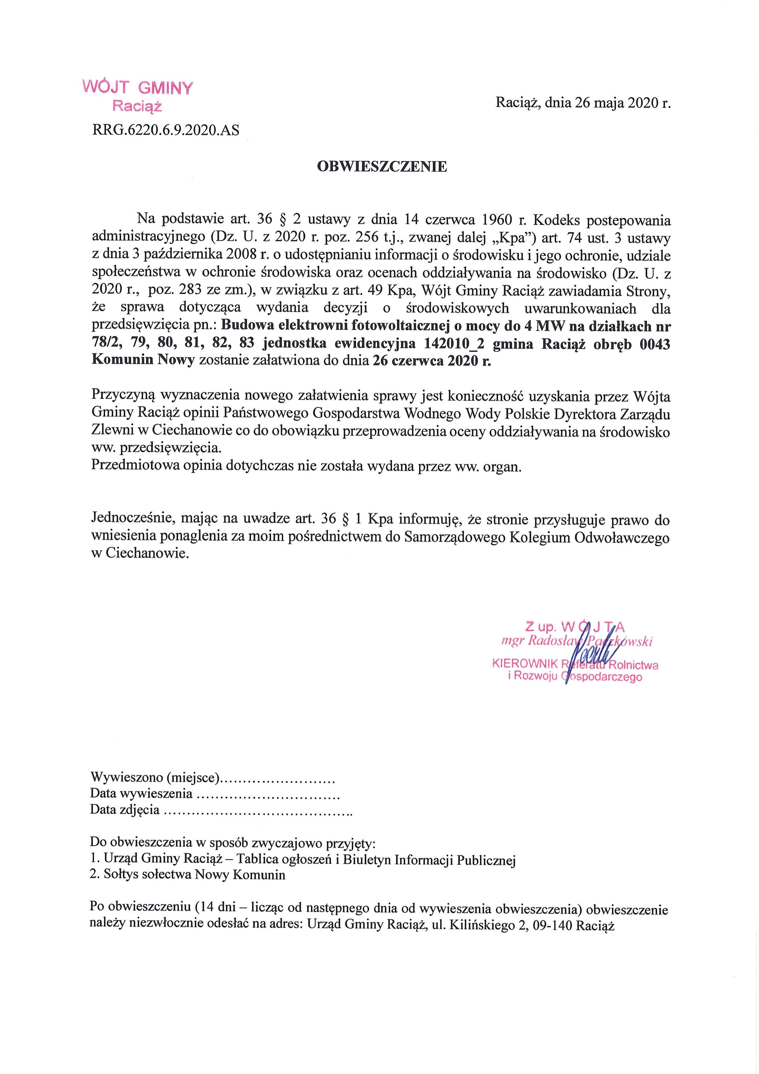 Budowa elektrowni fotowoltaicznej o mocy do 4 MW na działkach nr 78/2, 79, 80, 81, 82, 83 jednostka ewidencyjna 142010_2 gmina Raciąż obręb 0043 Komunin Nowy