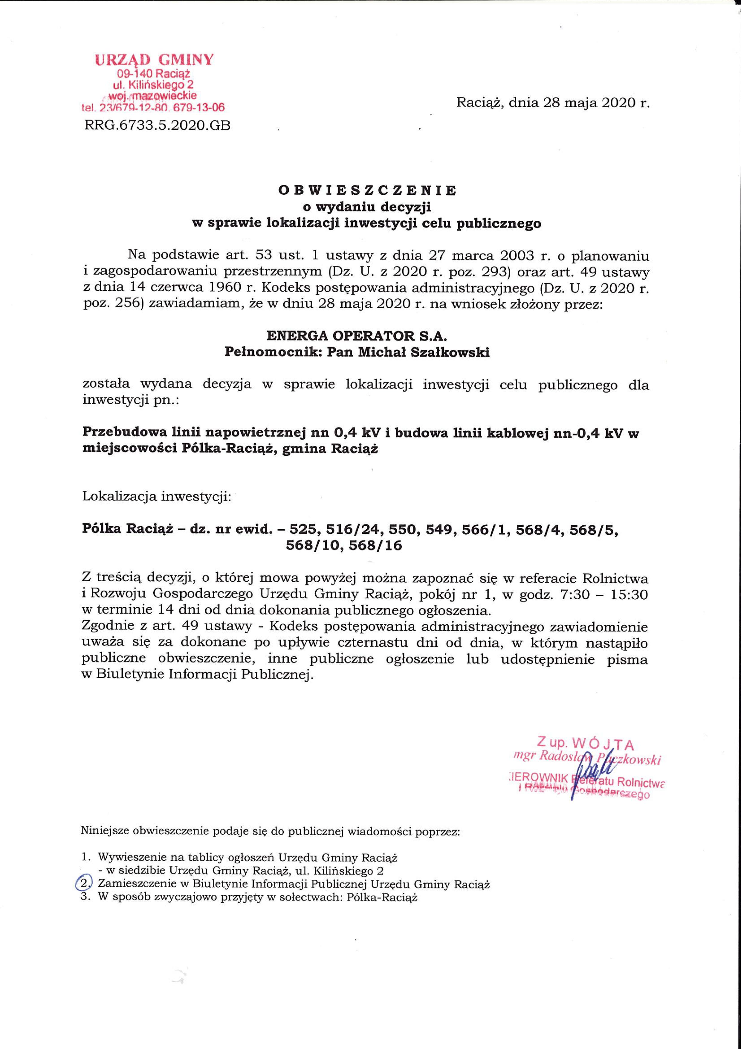 5.2020 Cel Publiczny – Obwieszczenie o wydaniu decyzji „Przebudowa linii napowietrznej nn 0,4 kV i budowa linii kablowej nn-0,4 kV w miejscowości Pólka-Raciąż”