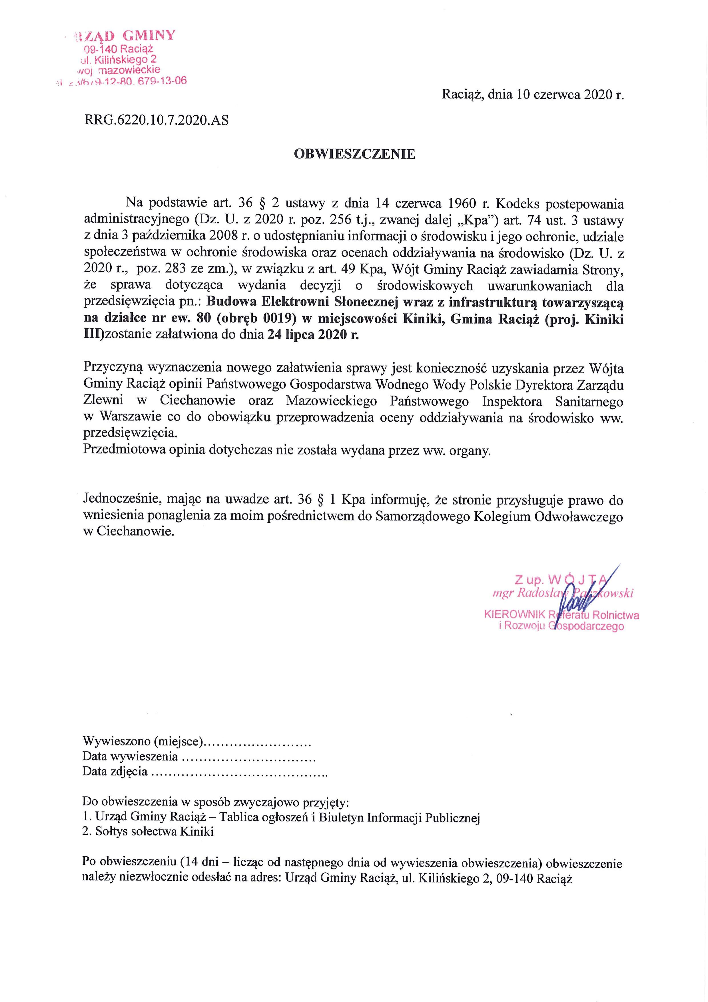 Budowa Elektrowni Słonecznej wraz z infrastrukturą towarzyszącą na działce nr ew. 80 (obręb 0019) w miejscowości Kiniki, Gmina Raciąż (proj. Kiniki III)