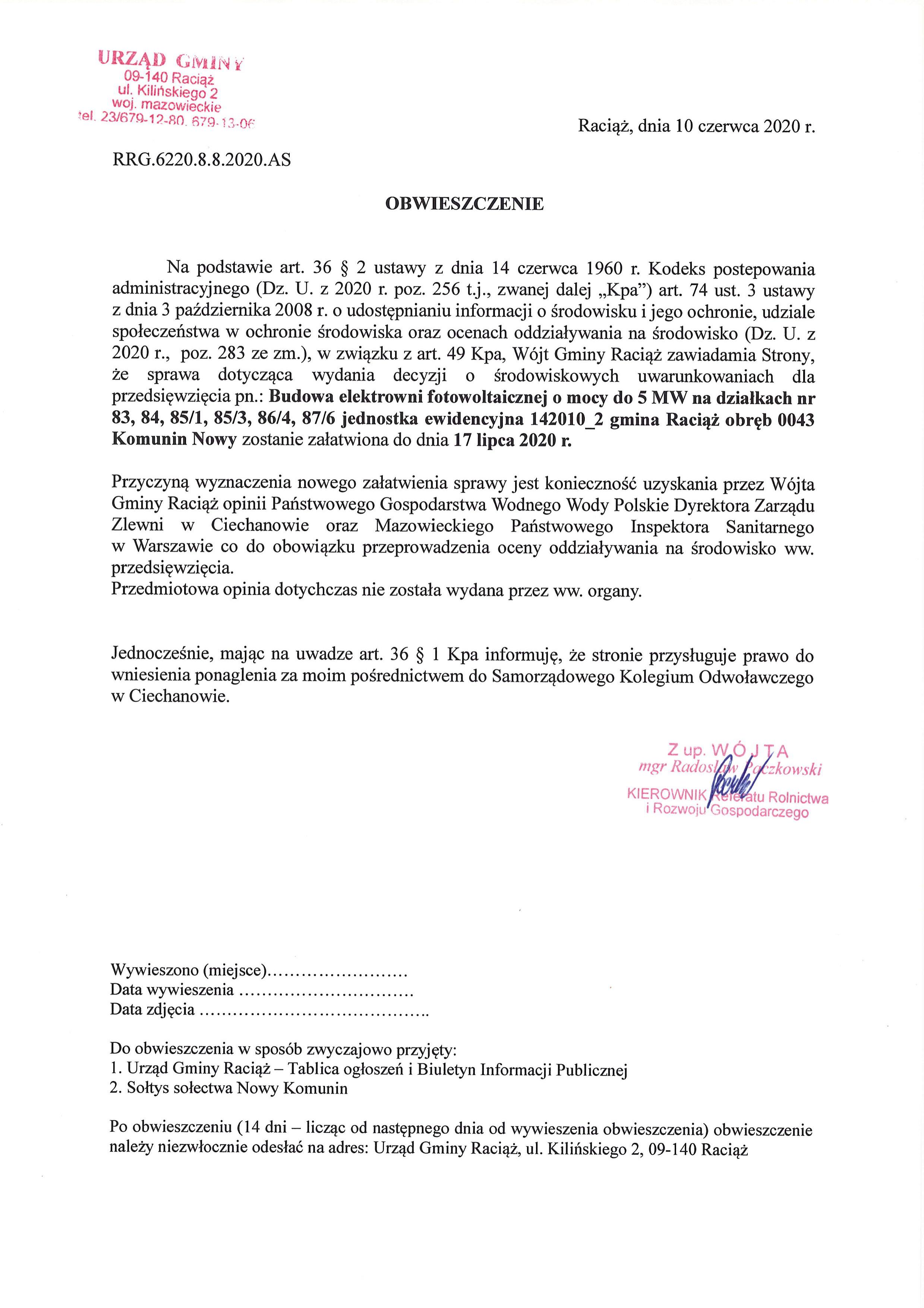 Budowa elektrowni fotowoltaicznej o mocy do 5 MW na działkach nr 83, 84, 85/1, 85/3, 86/4, 87/6 jednostka ewidencyjna 142010_2 gmina Raciąż obręb 0043 Komunin Nowy