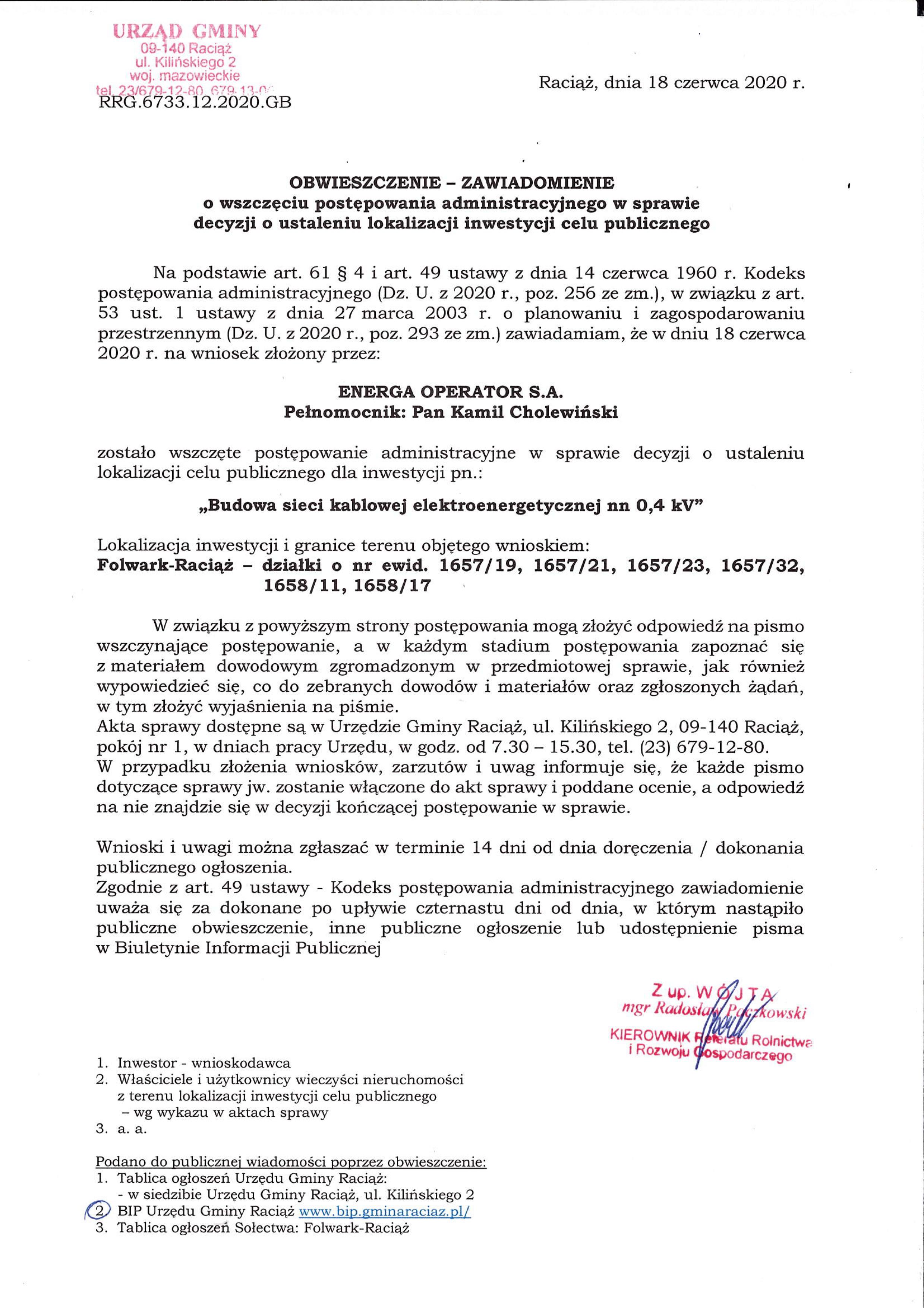 12.2020 Cel Publiczny – Obwieszczenie o wszczęciu postępowania pn. „Budowa sieci kablowej elektroenergetycznej nn 0,4kV” w miejscowości Folwark-Raciąż
