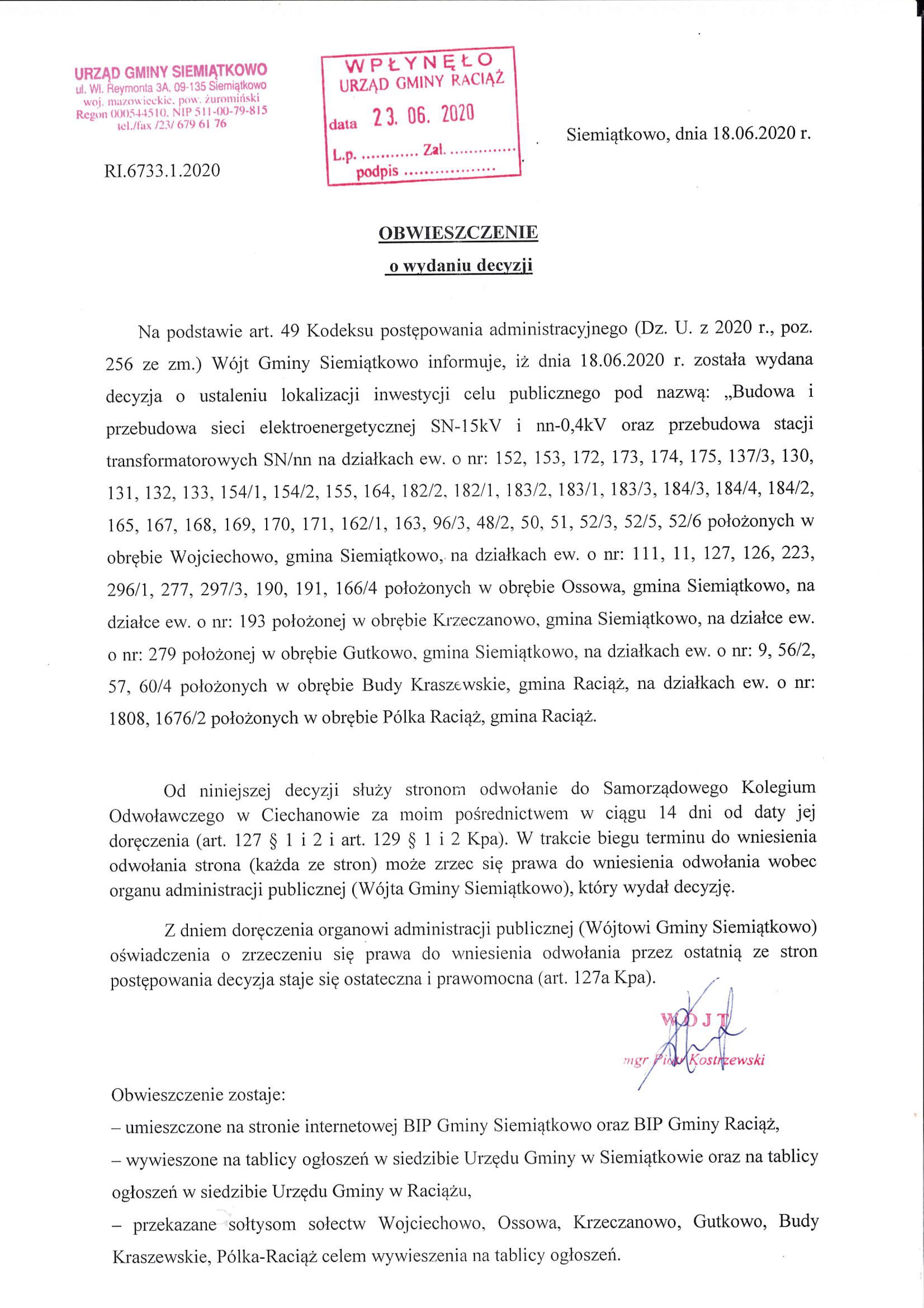 7.2020 Cel Publiczny w ramach współdziałania z gminą Siemiątkowo – Obwieszczenie o wydaniu decyzji pn. „Budowa i przebudowa sieci elektroenergetycznej SN-15kV i nn-0,4kV oraz przebudowa stacji transformatorowych SN/nn”