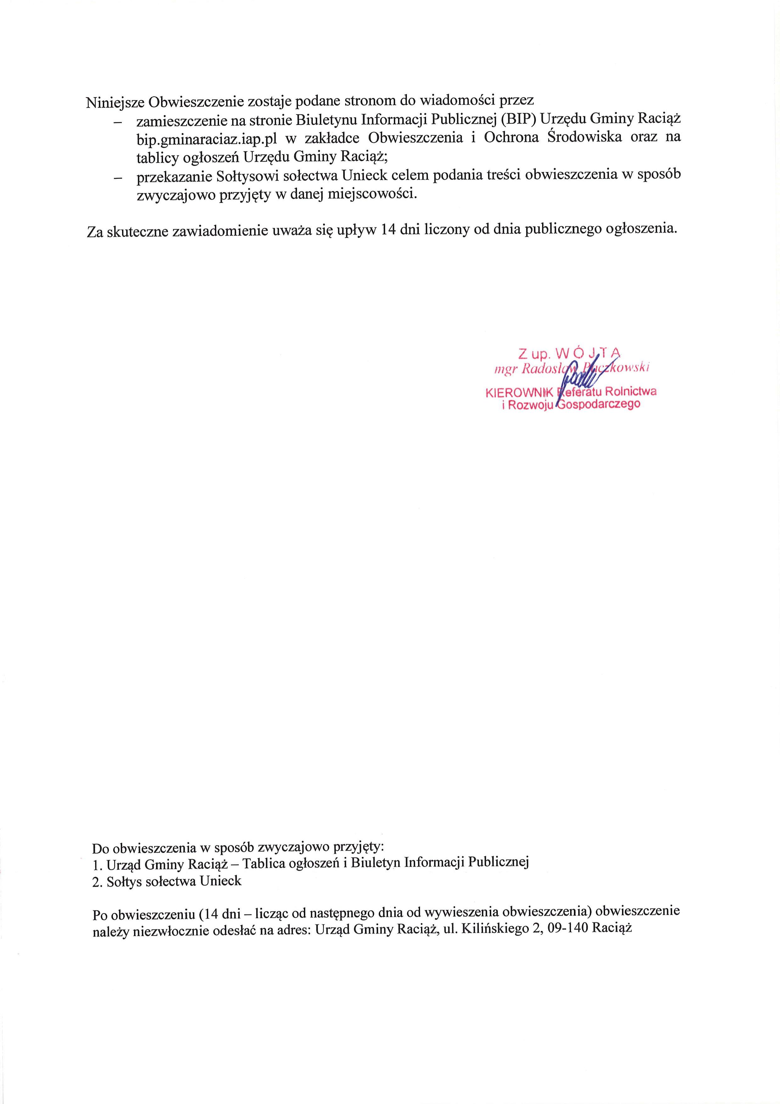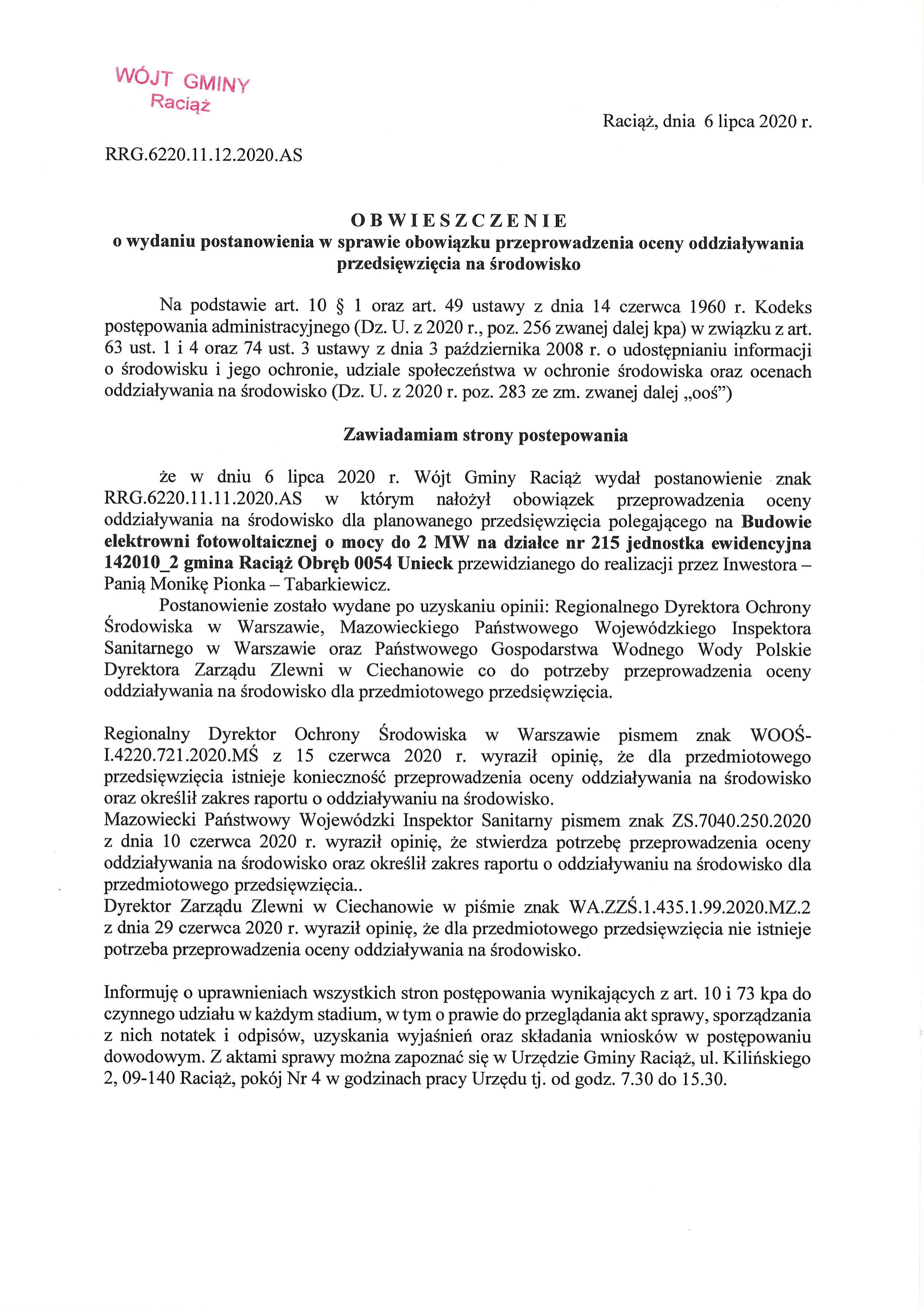 Budowa elektrowni fotowoltaicznej o mocy do 2 MW na działce nr 215 jednostka ewidencyjna 142010_2 gmina Raciąż Obręb 0054 Unieck