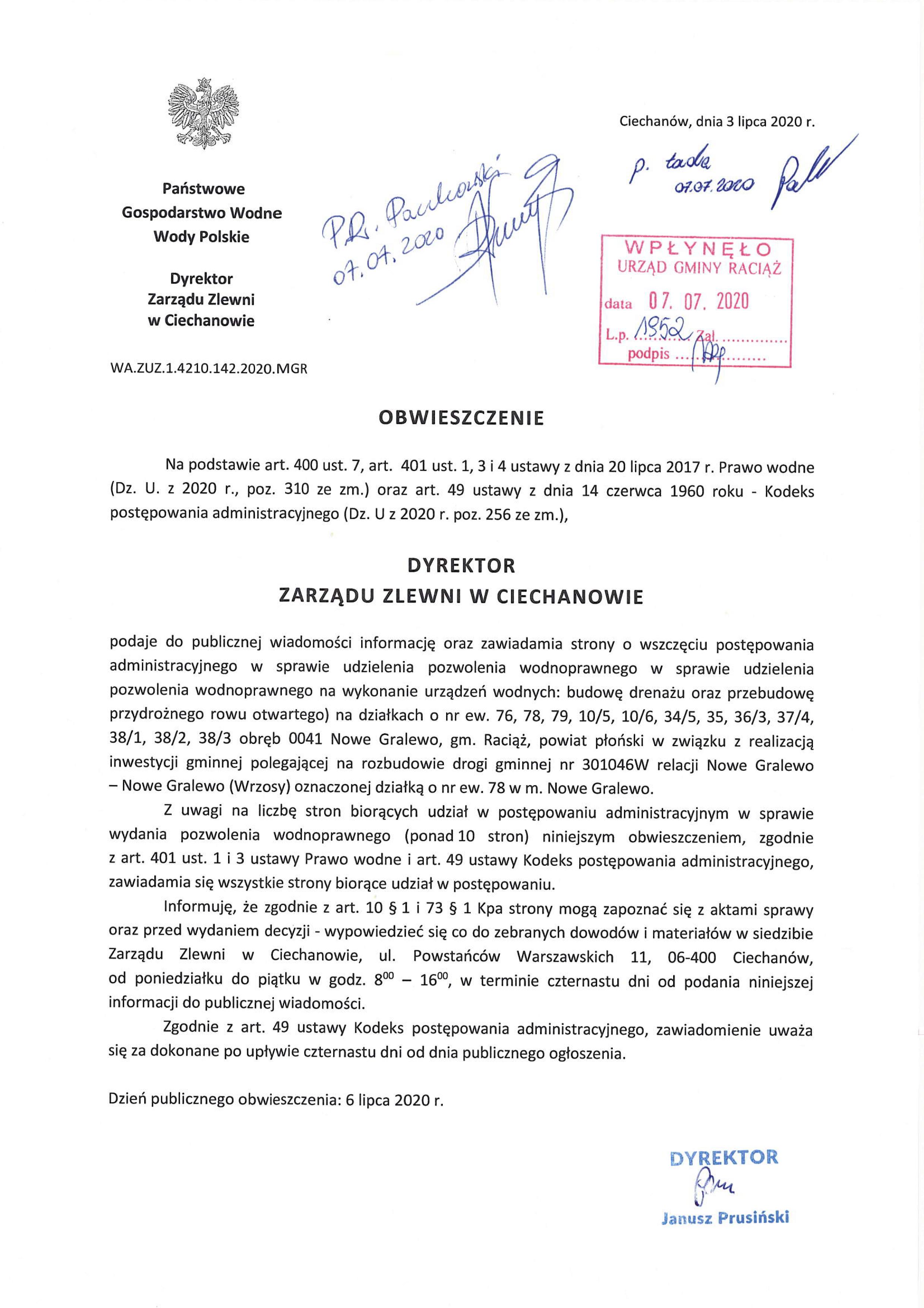 Obwieszczenie wodnoprawne droga Nowe Gralewo Wrzosy