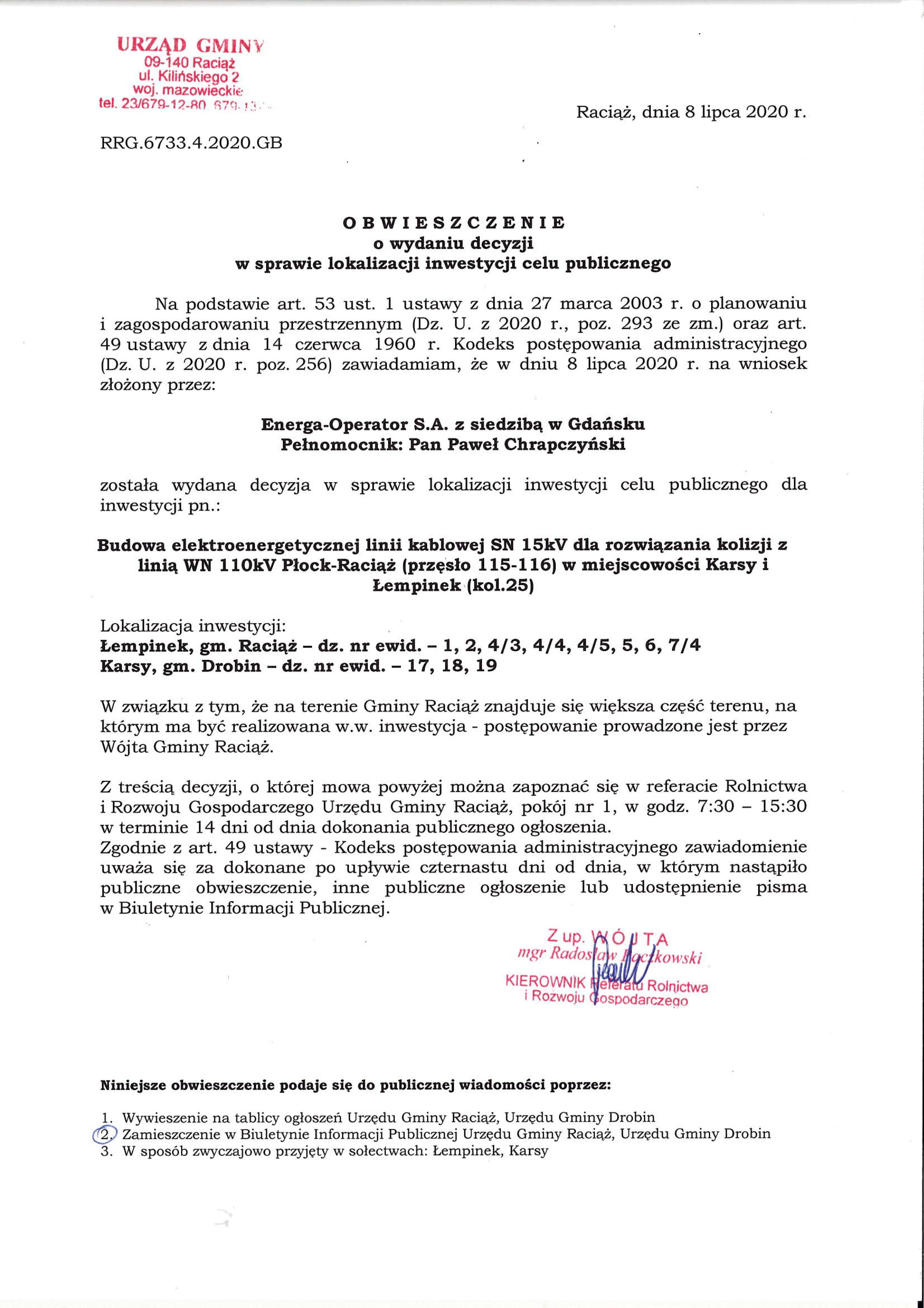 Tytył: 4.2020 Cel Publiczny – Obwieszczenie o wydaniu decyzji pn. „Budowa elektorenergetycznej linii kablowej SN 15kV dla rozwiązania kolizji z linią WN 110 kV Płock-Raciąż (przęsło 115-116) w miejscowości Karsy i Łempinek (kol.25)