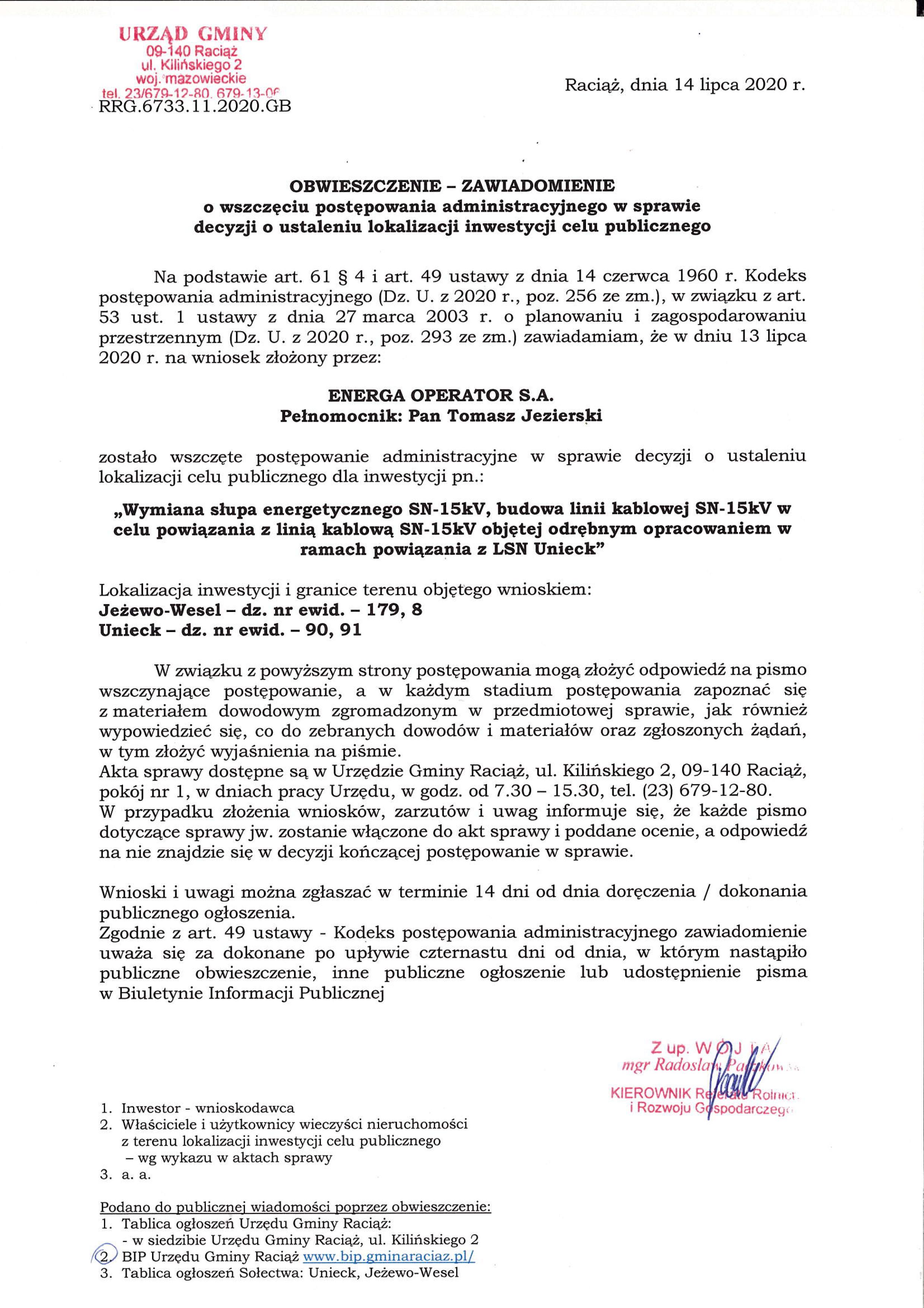 11.2020 Cel Publiczny – Obwieszczenie o wszczęciu postępowania pn. „Wymiana słupa energetycznego SN-15kV, budowa linii kablowej SN-15kV w celu powiązania z linią kablową SN-15kV objętej odrębnym opracowaniem w ramach powiązania z LSN Unieck”