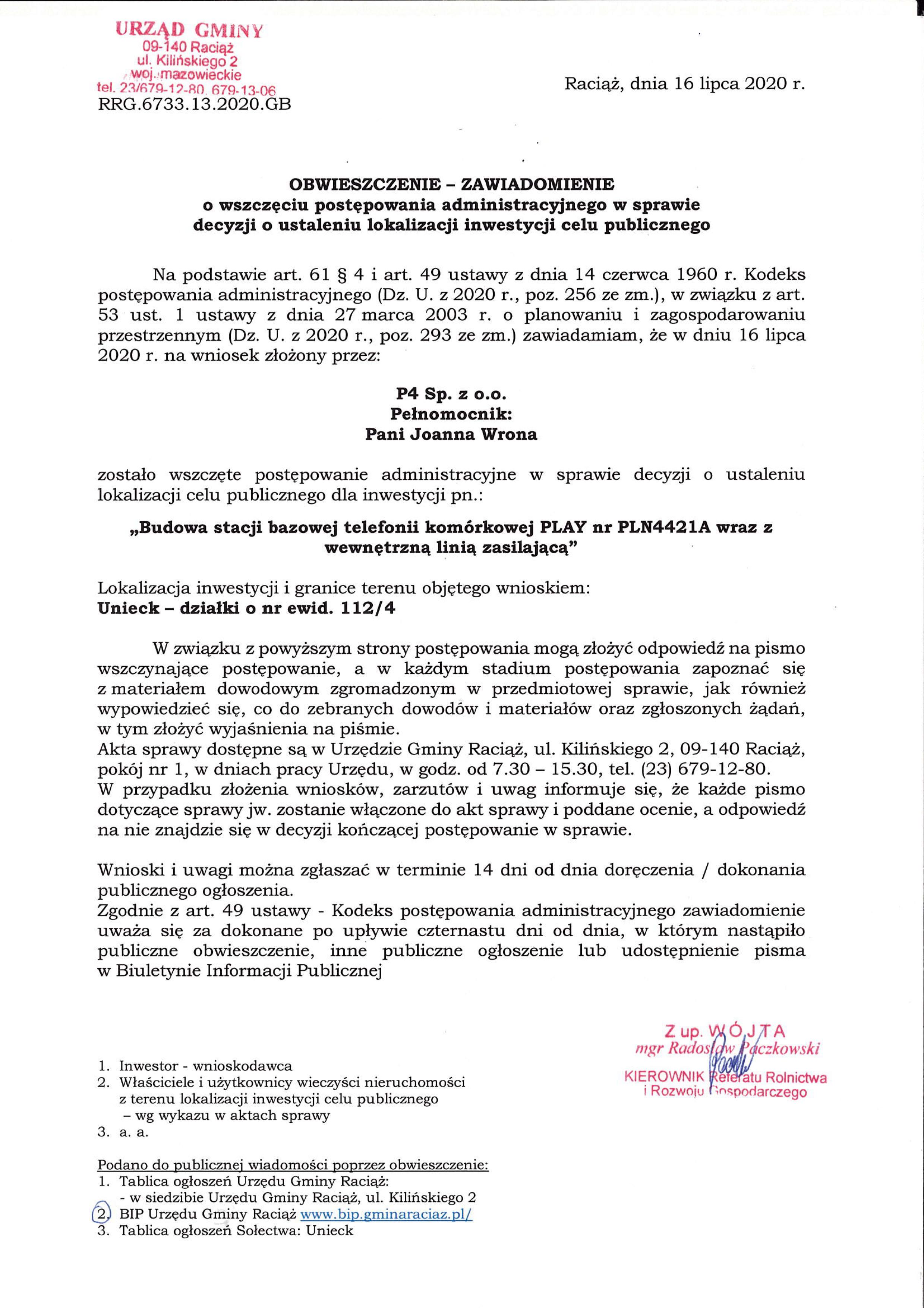 13.2020 Cel Publiczny – Obwieszczenie o wszczęciu postępowania pn. „Budowa stacji bazowej telefonii komórkowej PLAY nr PLN4421A wraz z wewnętrzną linią zasilającą” w miejscowości Unieck