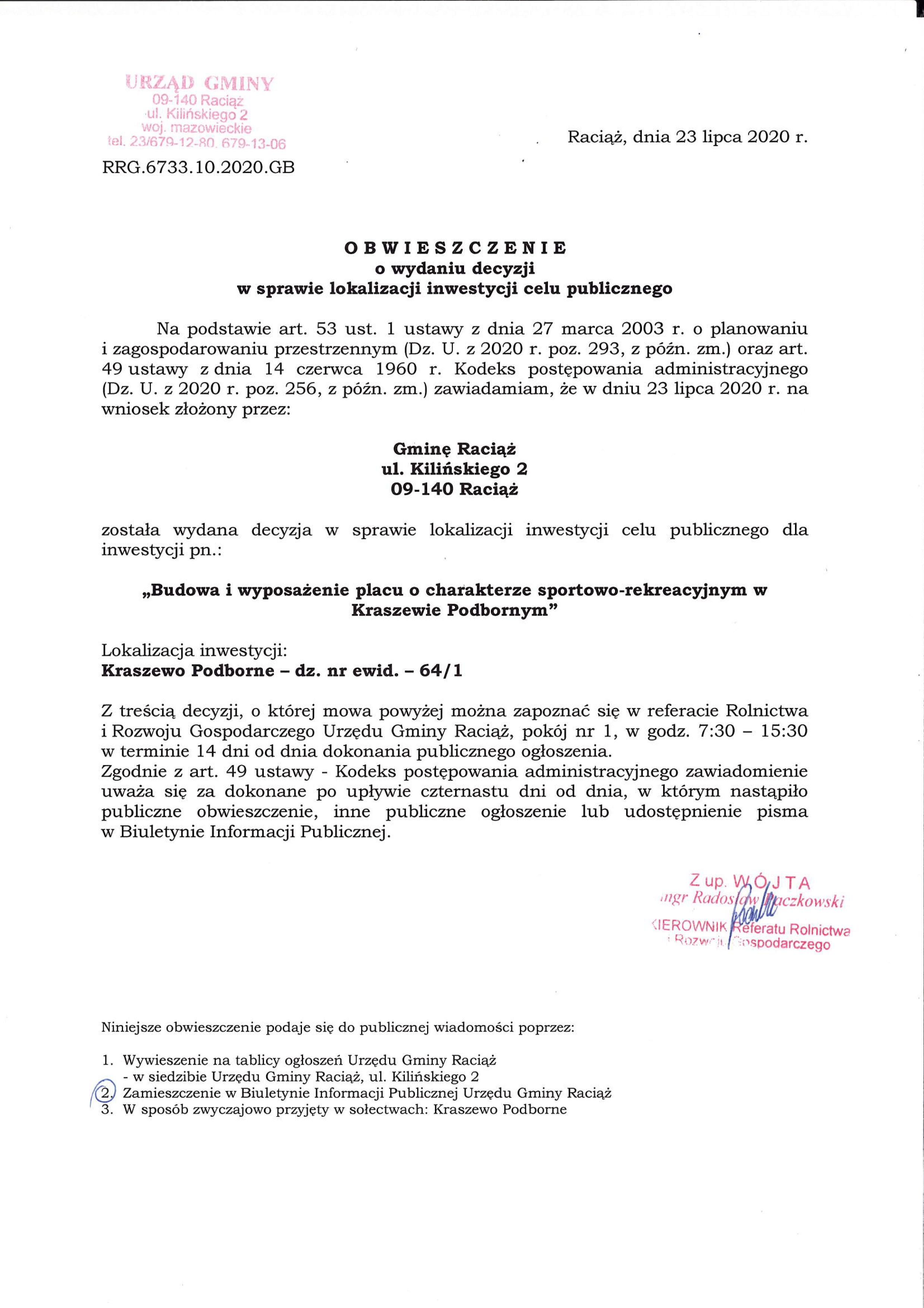 10.2020 Cel Publiczny – Obwieszczenie o wydaniu decyzji pn. Budowa i wyposażenie placu o charakterze sportowo-rekreacyjnym w Kraszewie-Podbornym