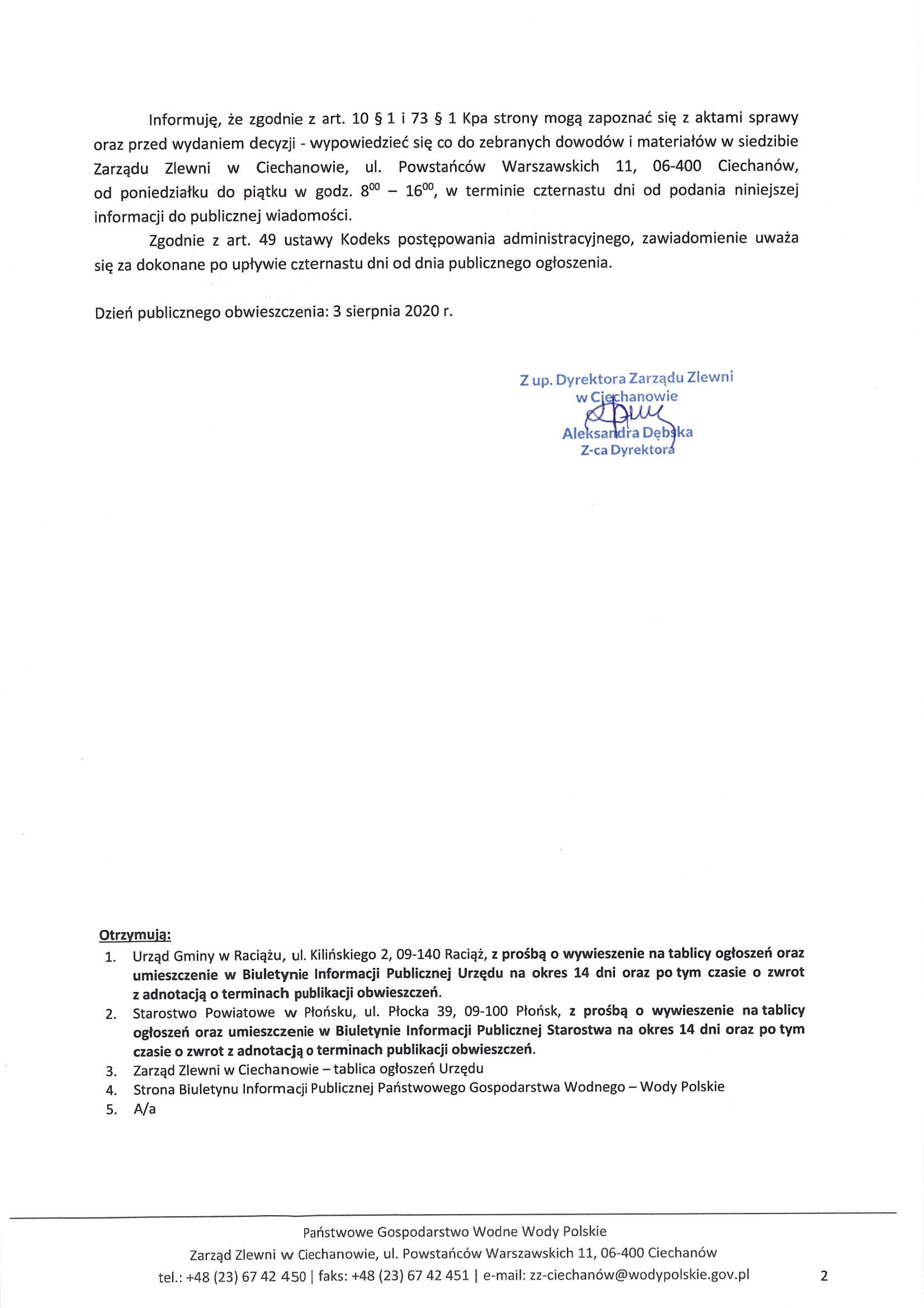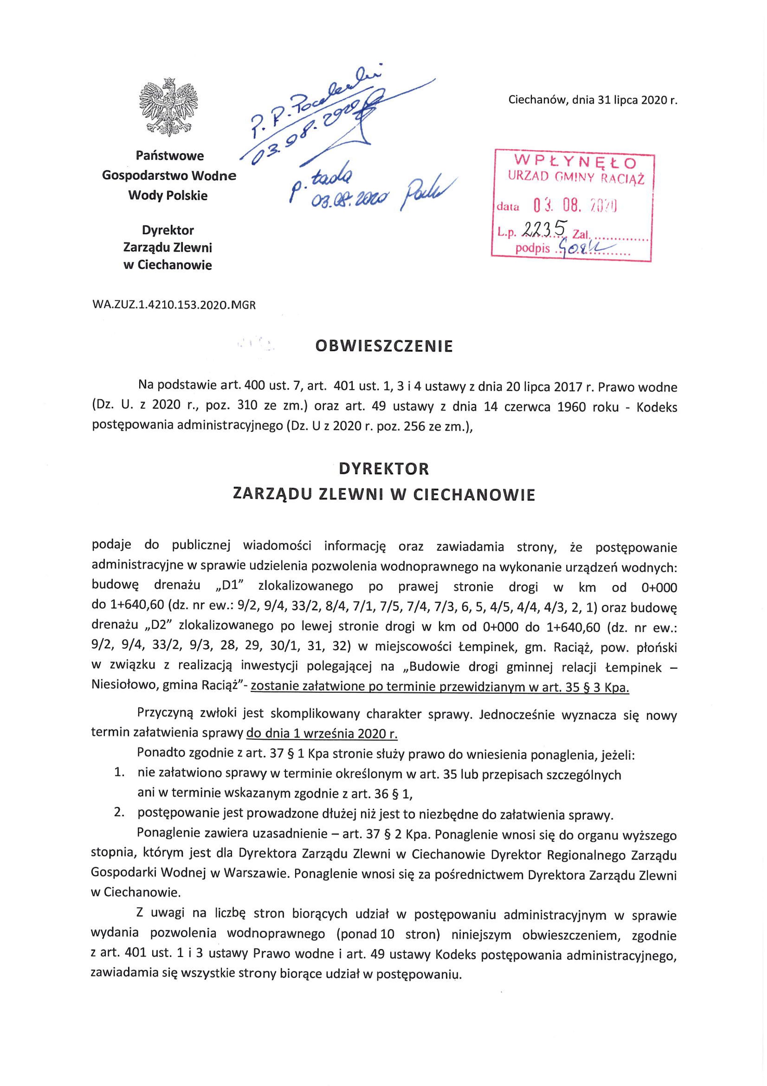 Obwieszczenie wodnoprawne załatwienie sprawy po terminie - droga Łempinek - Niesiołowo