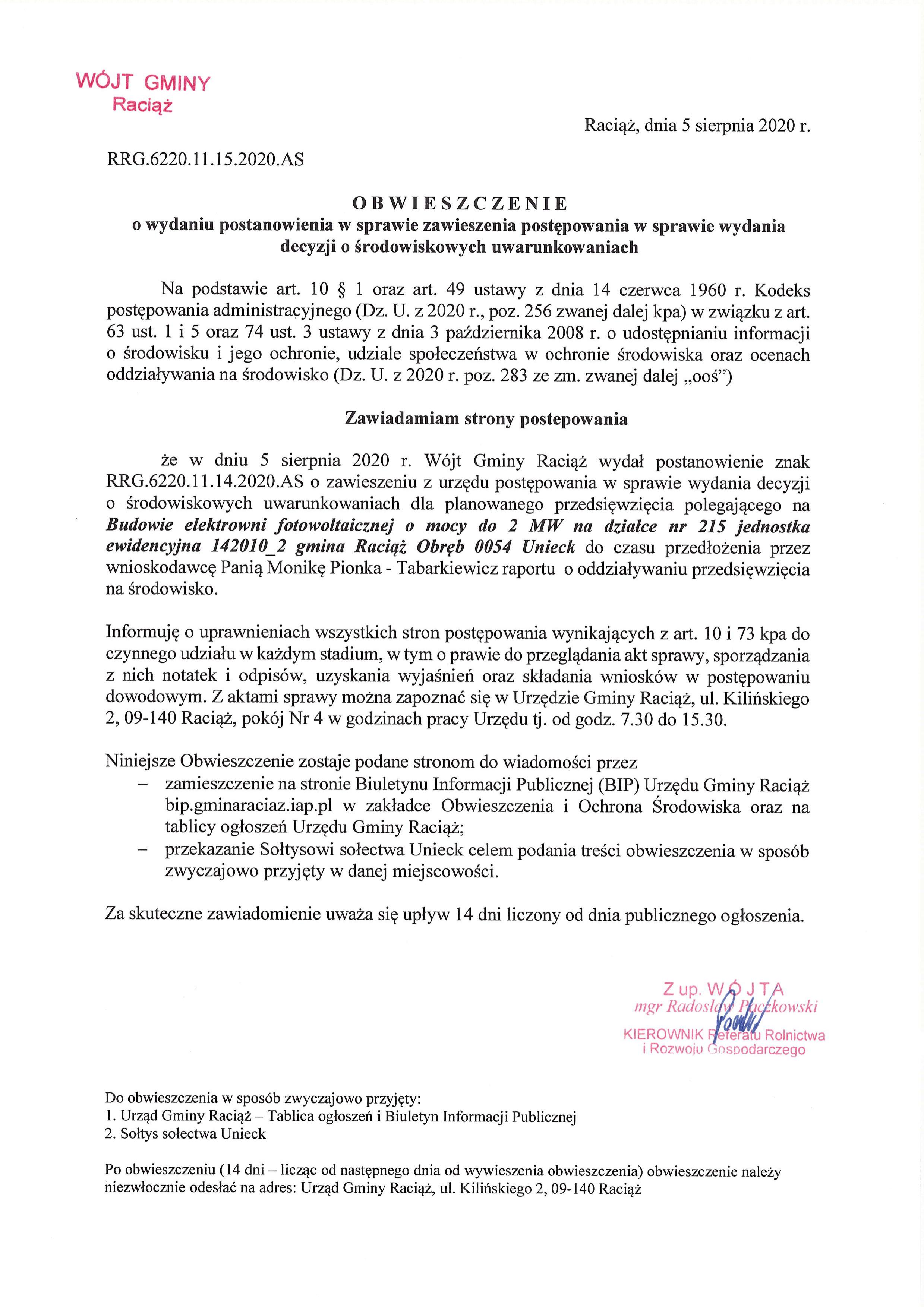 Budowa elektrowni fotowoltaicznej o mocy do 2 MW na działce nr 215 jednostka ewidencyjna 142010_2 gmina Raciąż Obręb 0054 Unieck