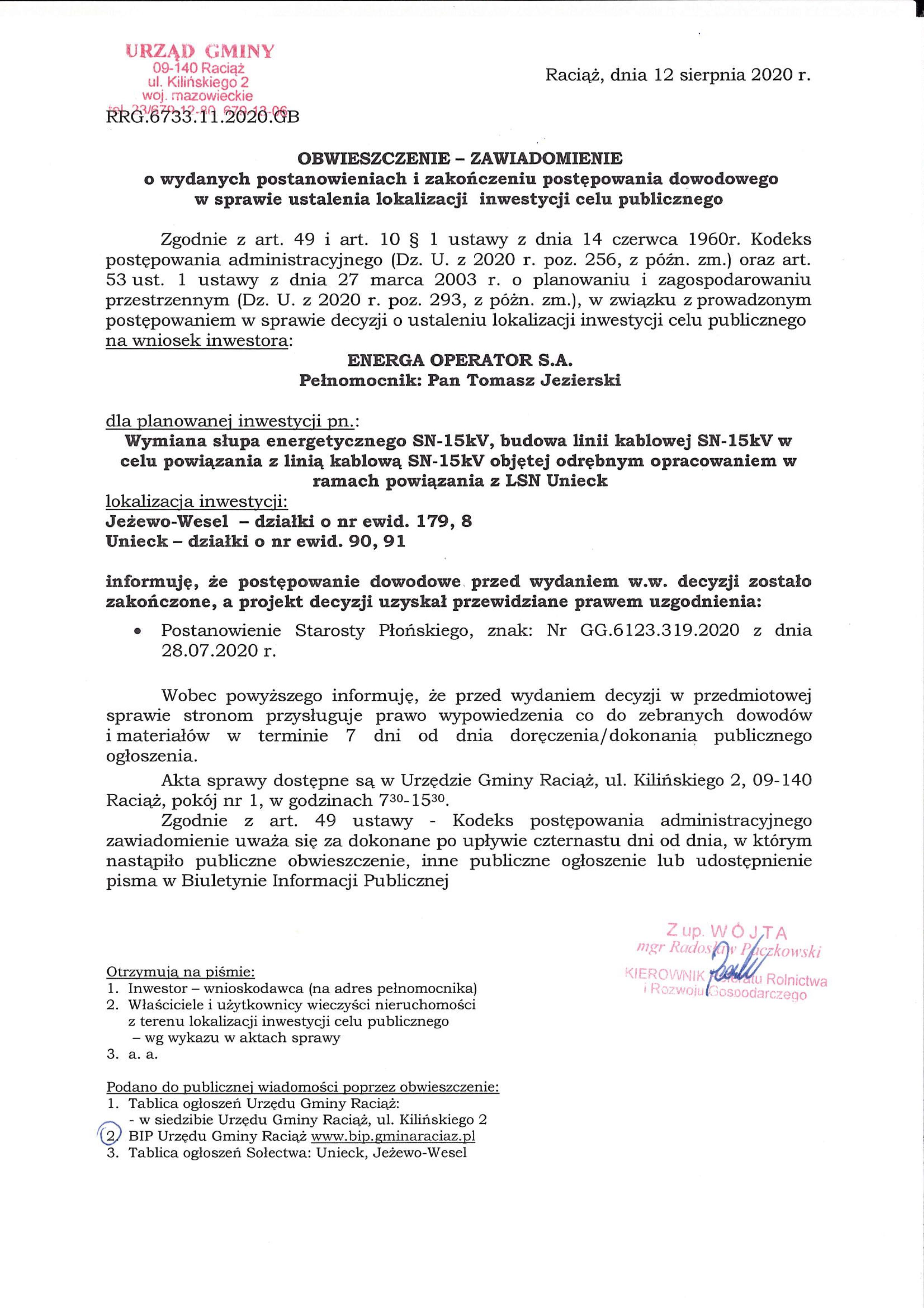 11.2020 Cel Publiczny – Obwieszczenie o wydanych postanowieniach i zakończeniu postępowania dowodowego pn.