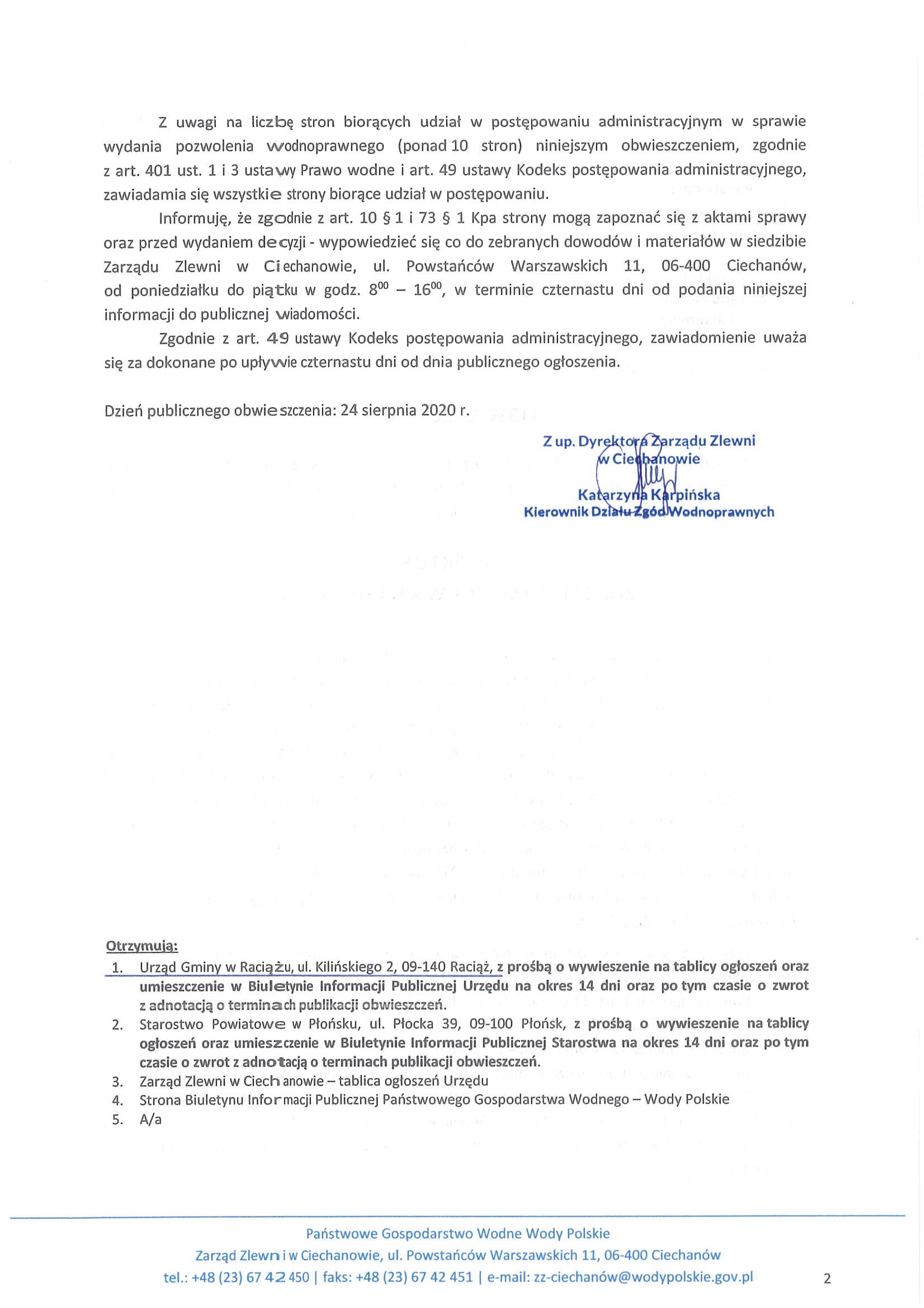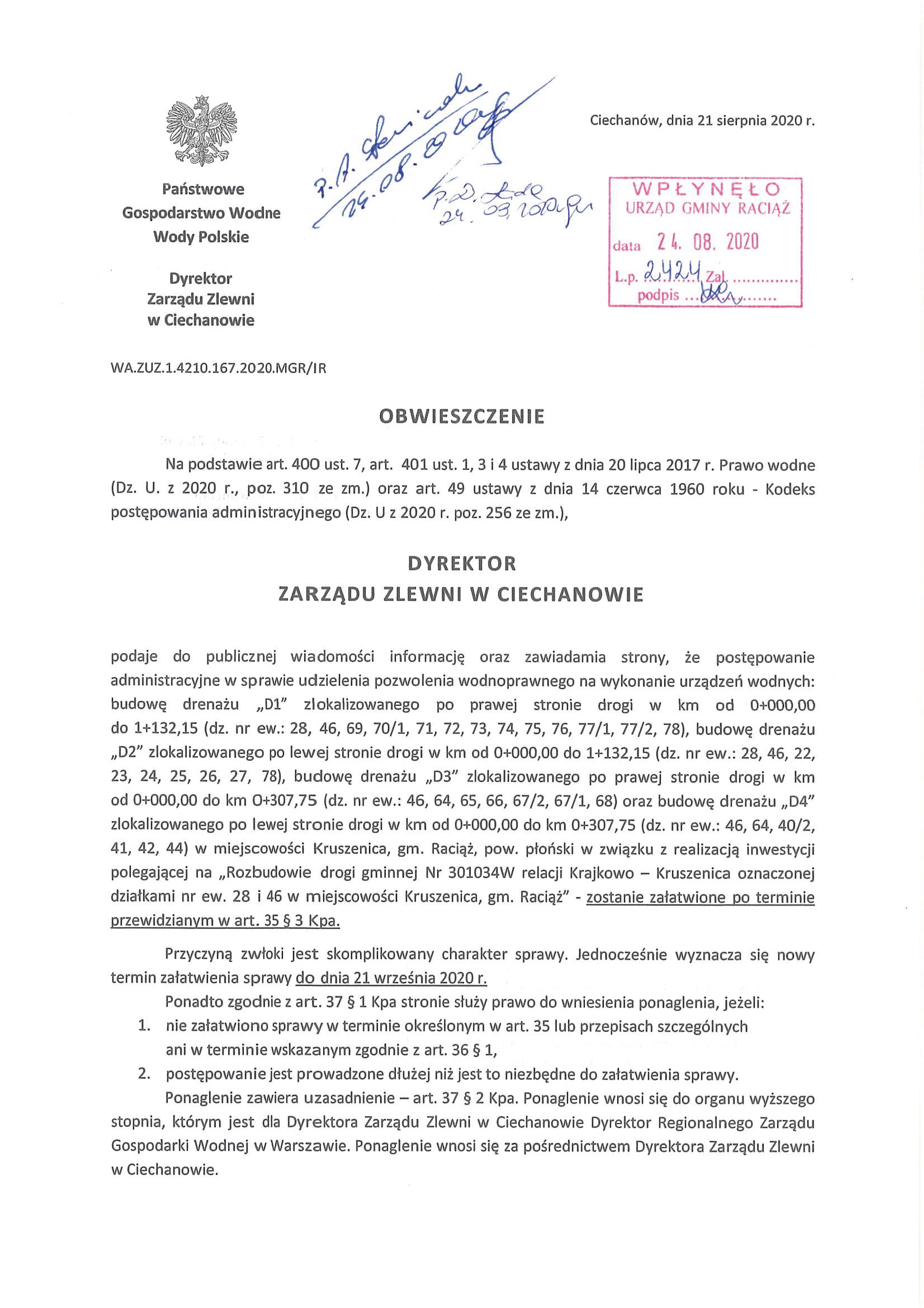 Obwieszczenie wodnoprawne – załatwienie sprawy po terminie droga Krajkowo-Kruszenica