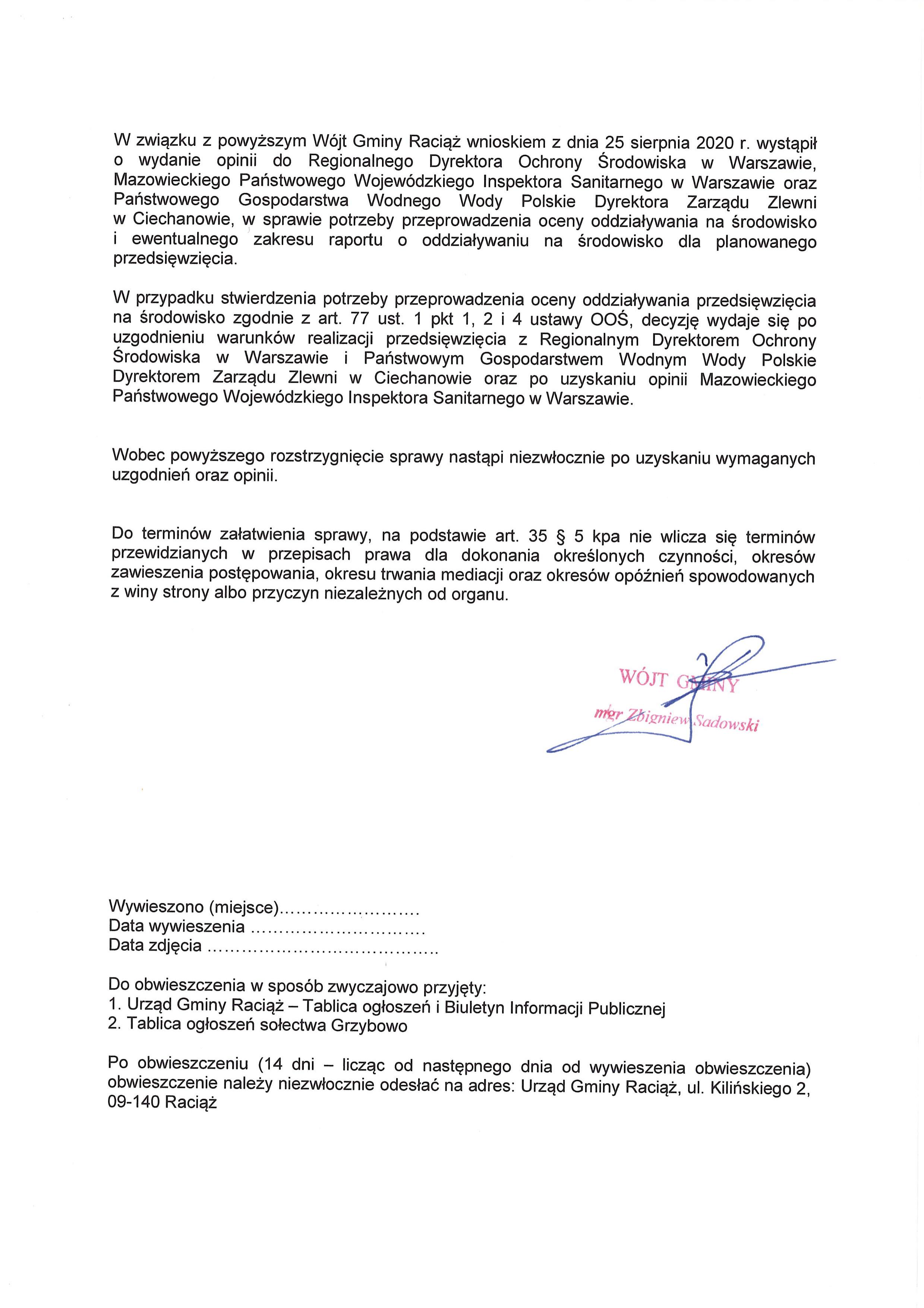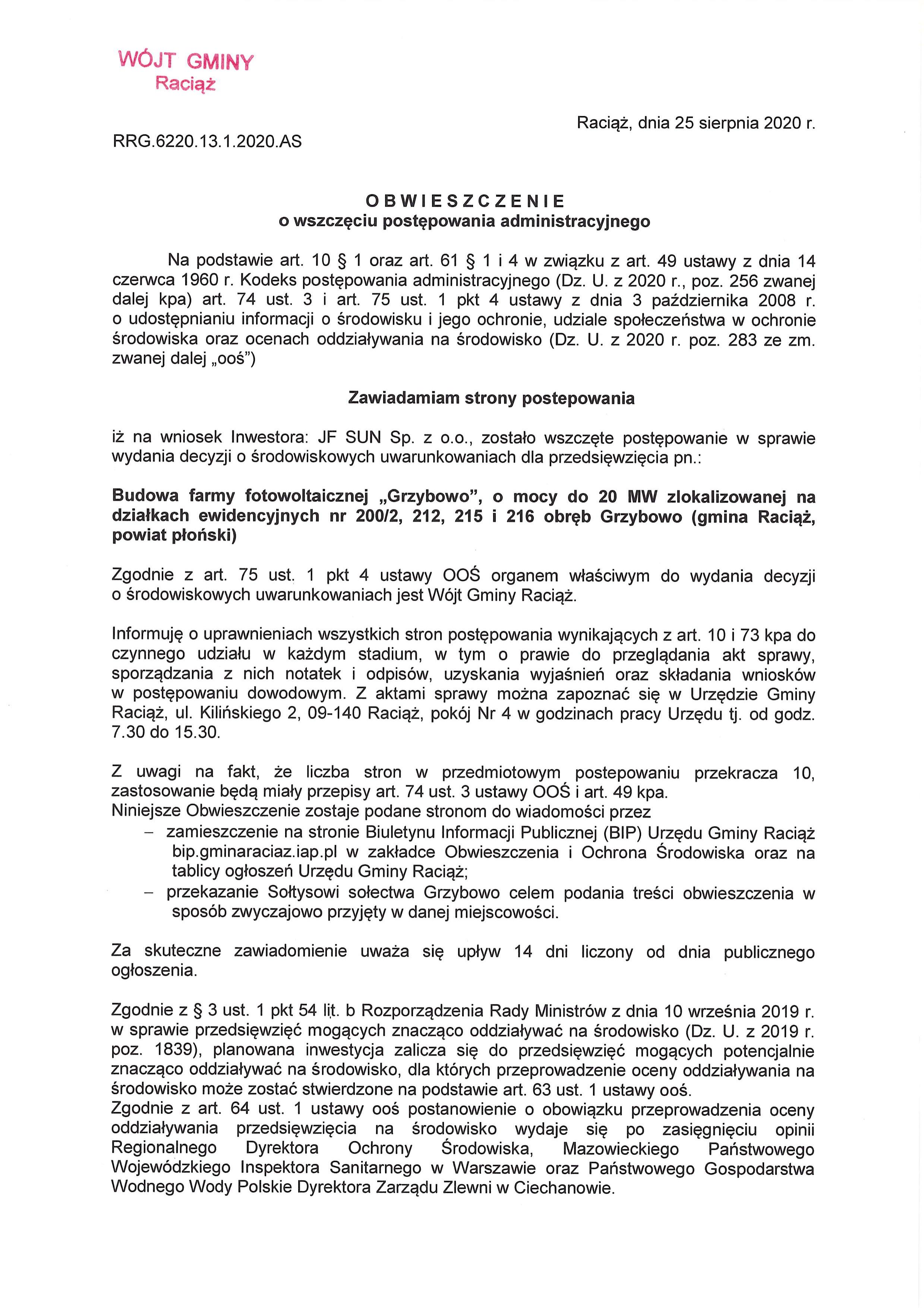 Budowa farmy fotowoltaicznej „Grzybowo”, o mocy do 20 MW zlokalizowanej na działkach ewidencyjnych nr 200/2, 212, 215 i 216 obręb Grzybowo (gmina Raciąż, powiat płoński)