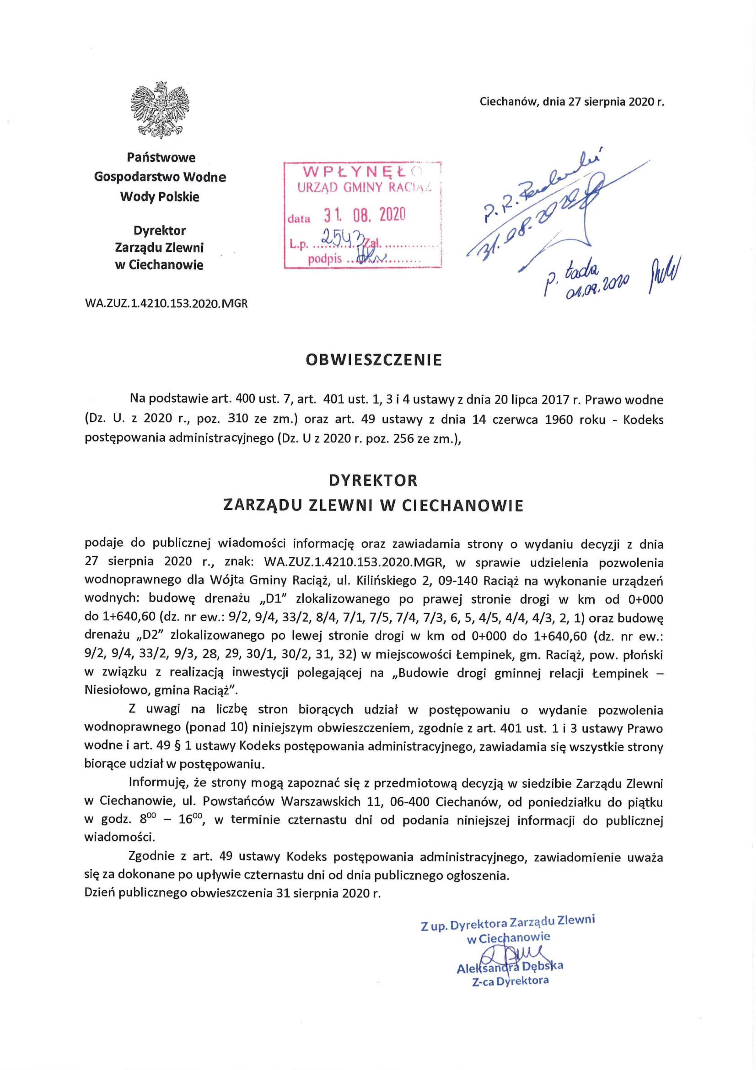 Obwieszczenie wodnoprawne - wydanie decyzji droga Łempinek – Niesiołowo