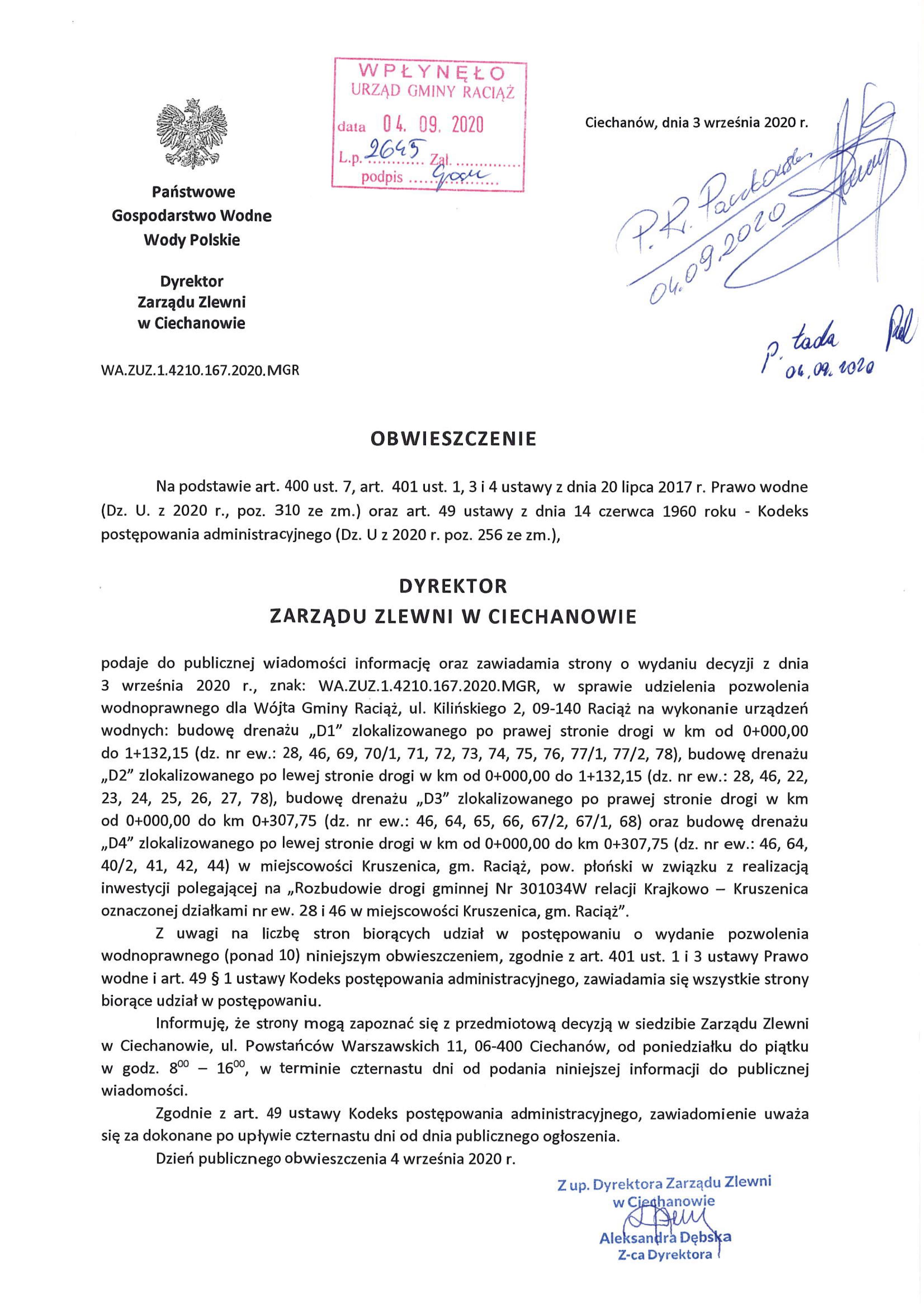 Obwieszczenie wodnoprawne - wydanie decyzji droga Krajkowo-Kruszenica