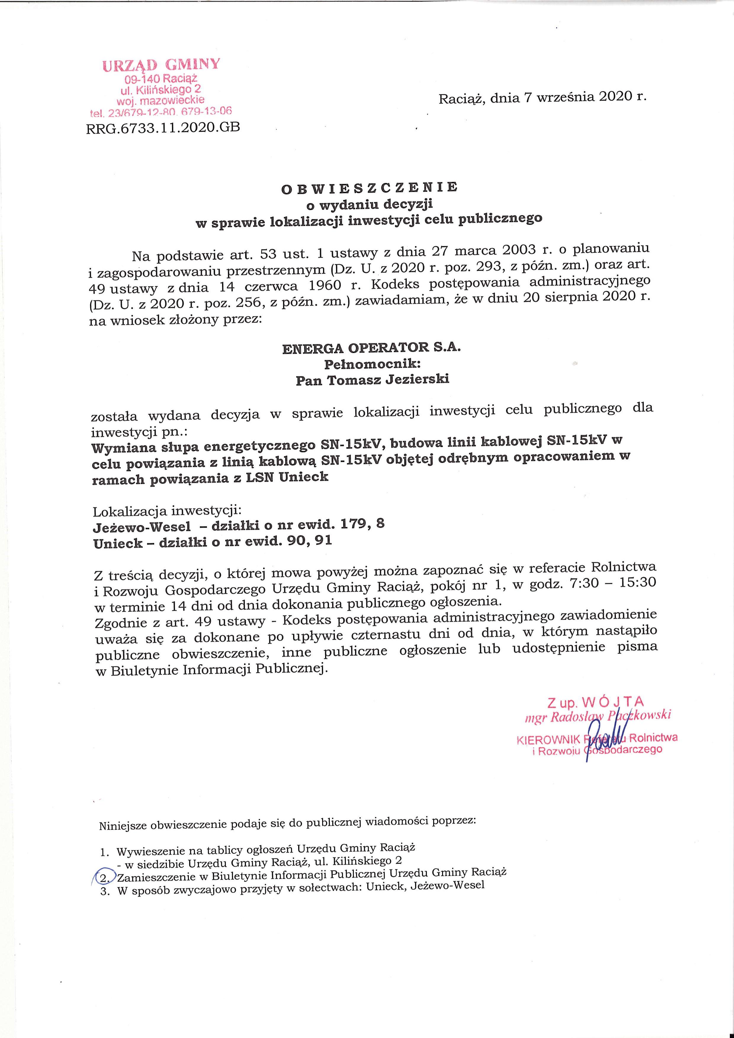 11.2020 Cel Publiczny – Obwieszczenie o wydaniu decyzji pn. Wymiana słupa energetycznego SN-15kV, budowa linii kablowej SN-15kV w celu powiązania z linią kablową SN-15kV objętej odrębnym opracowaniem w ramach powiązania z LSN Unieck