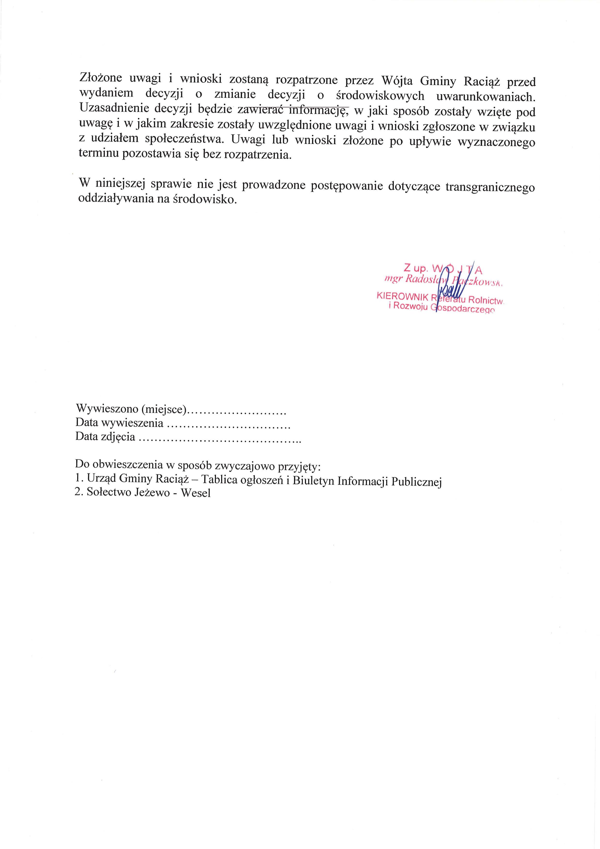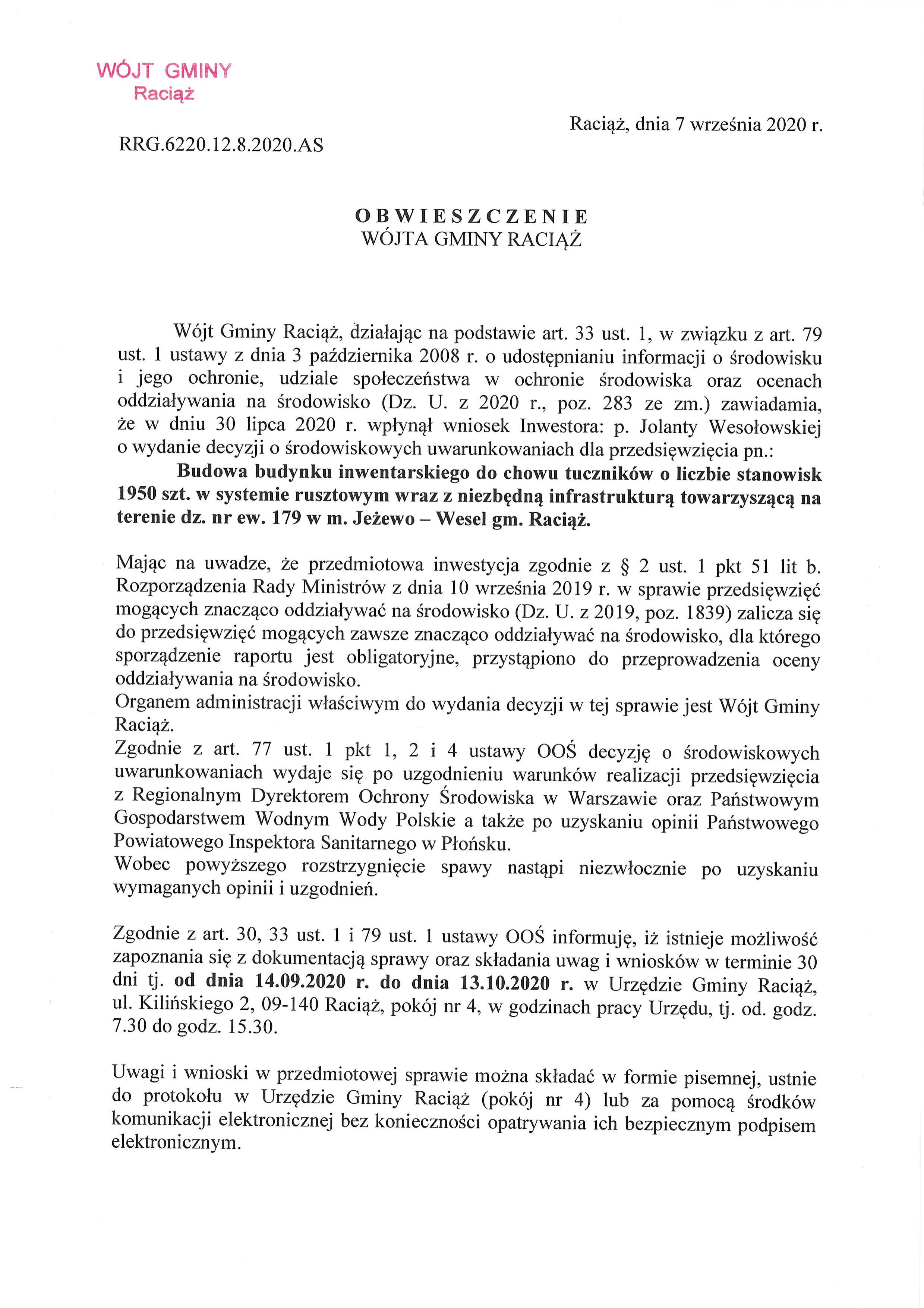 Budowa budynku inwentarskiego do chowu tuczników o liczbie stanowisk 1950 szt. w systemie rusztowym wraz z niezbędną infrastrukturą towarzyszącą na terenie dz. nr ew. 179 w m. Jeżewo – Wesel gm. Raciąż