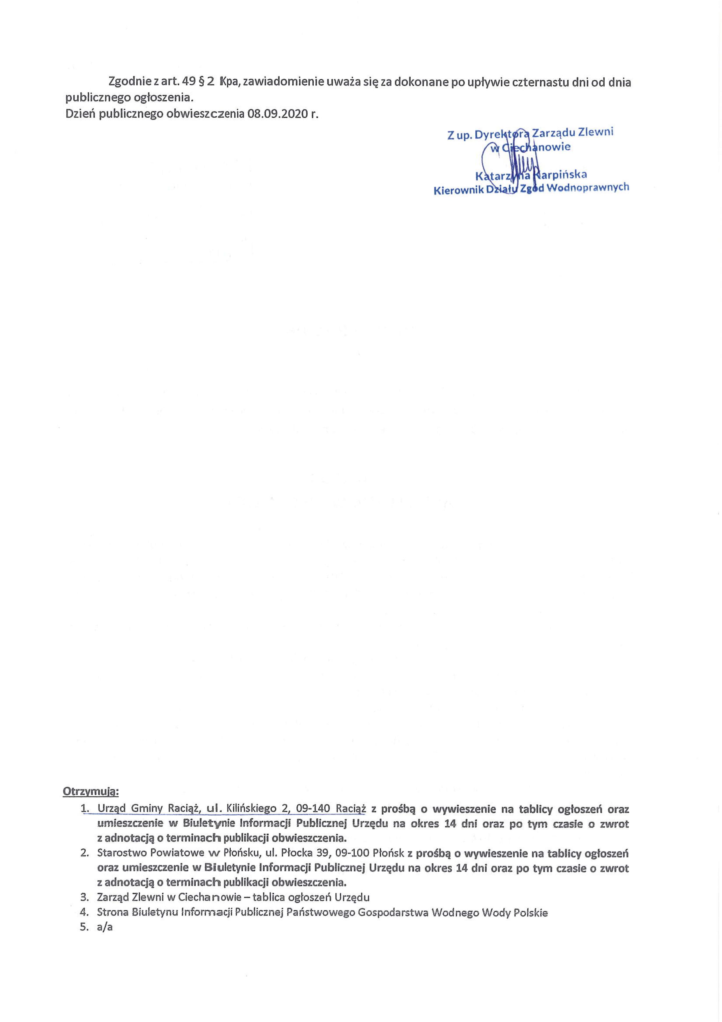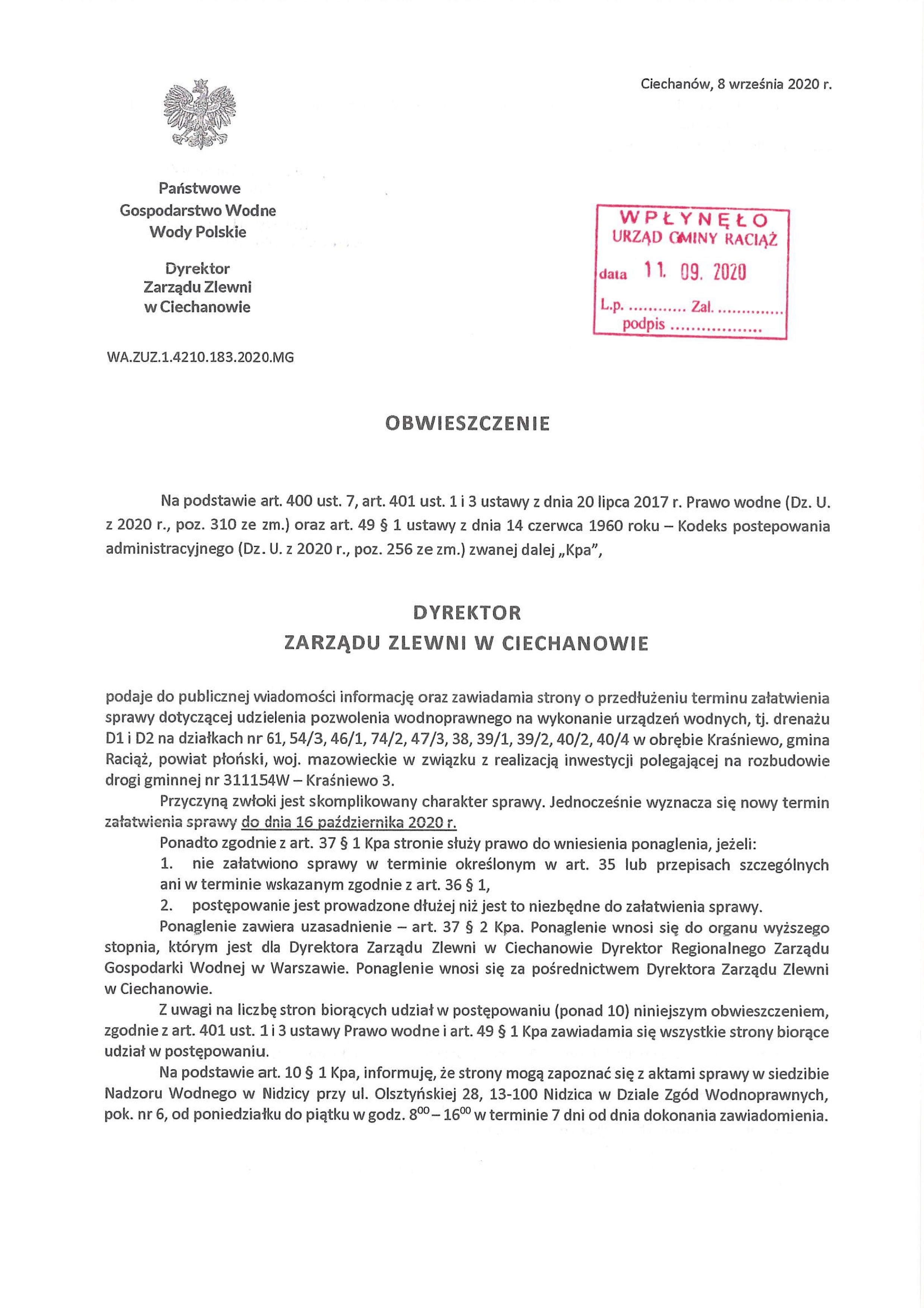 Obwieszczenie wodnoprawne - załatwienie sprawy po terminie droga Kraśniewo 3