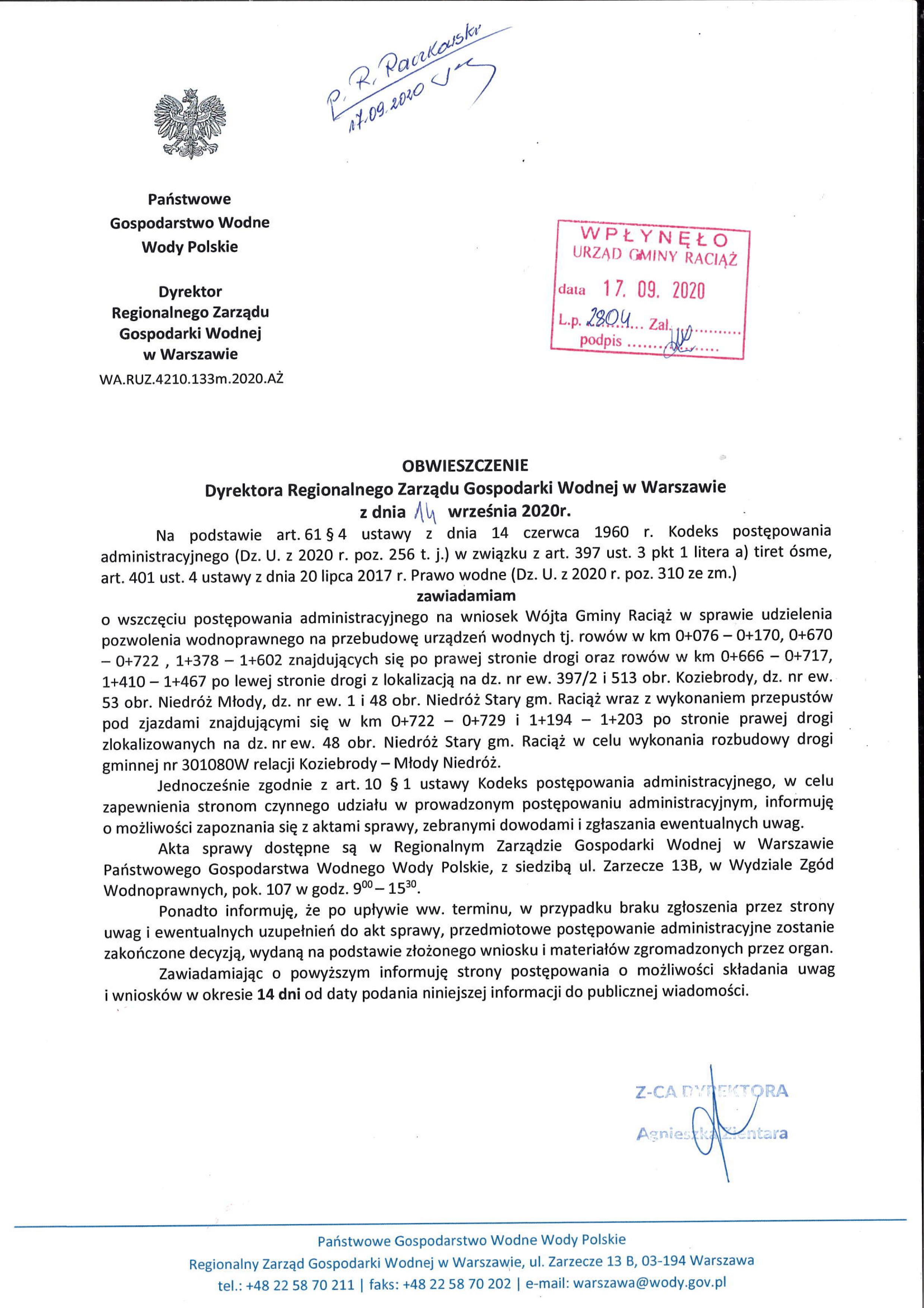 Obwieszczenie wodnoprawne - wszczęcie postępowania droga Koziebrody - Młody Niedróż Nr 301080W