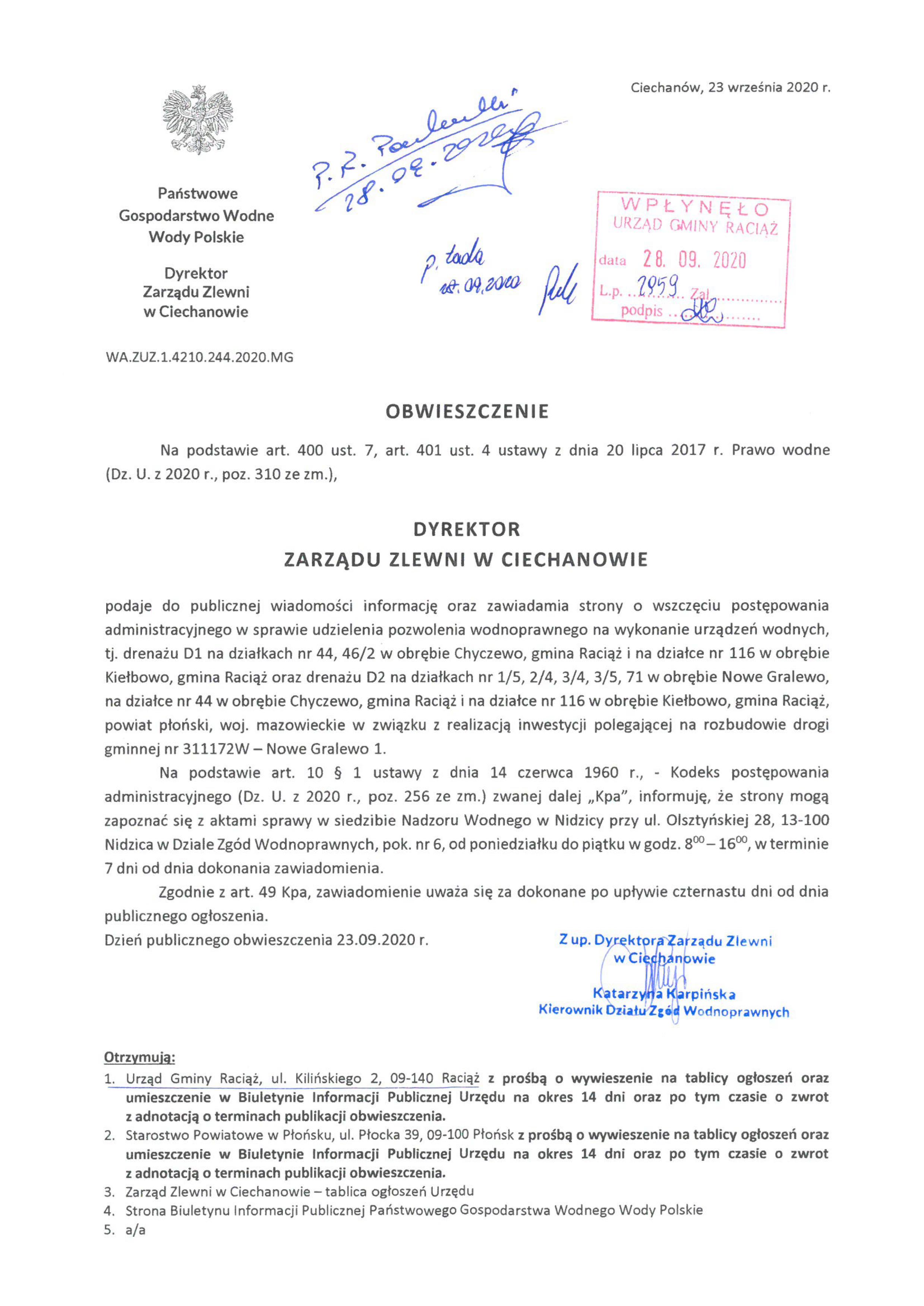 Obwieszczenie wodnoprawne - wszczęcie postępowania droga Nowe Gralewo