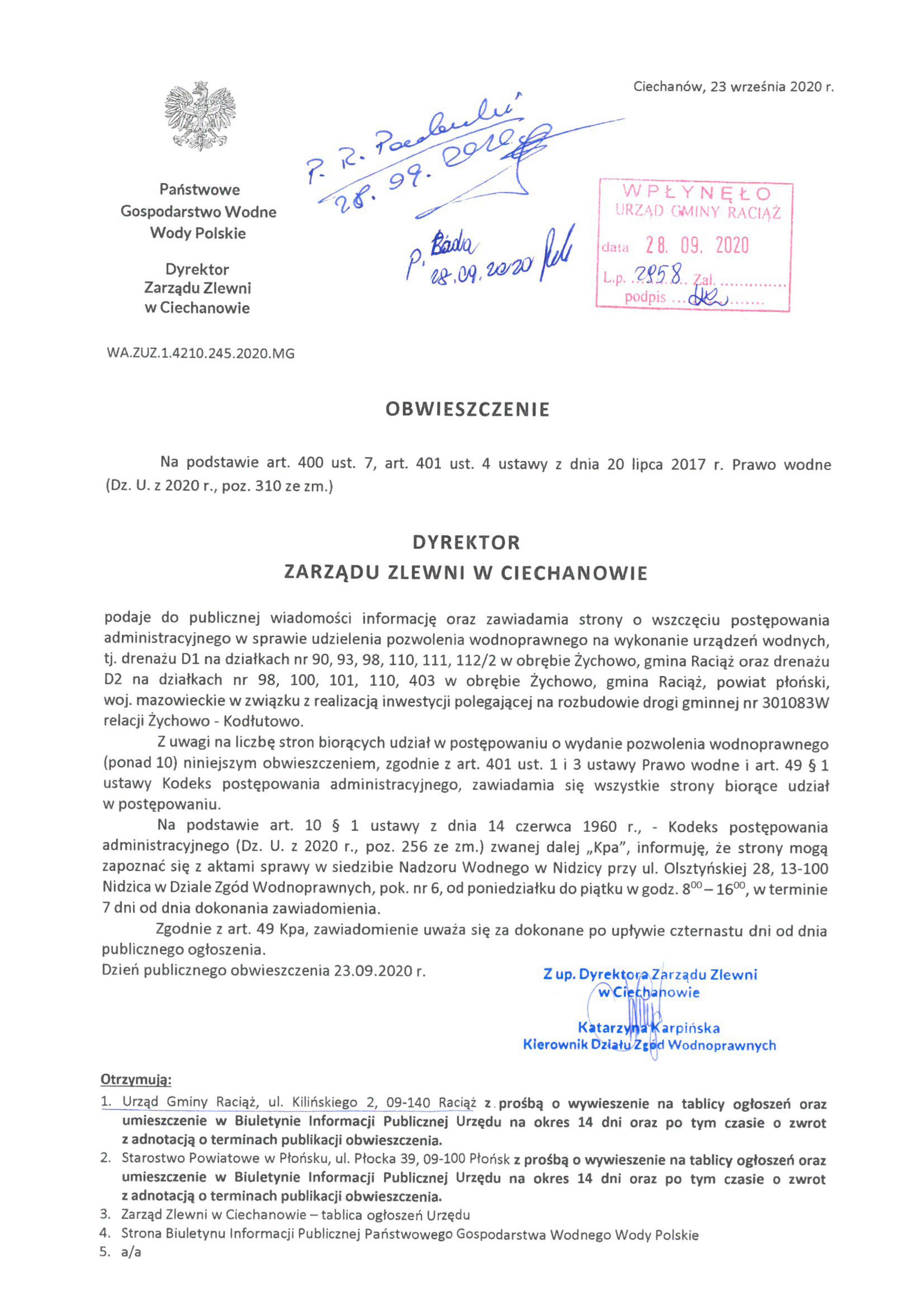 Obwieszczenie wodnoprawne - wszczęcie postępowania droga Żychowo-Kodłutowo