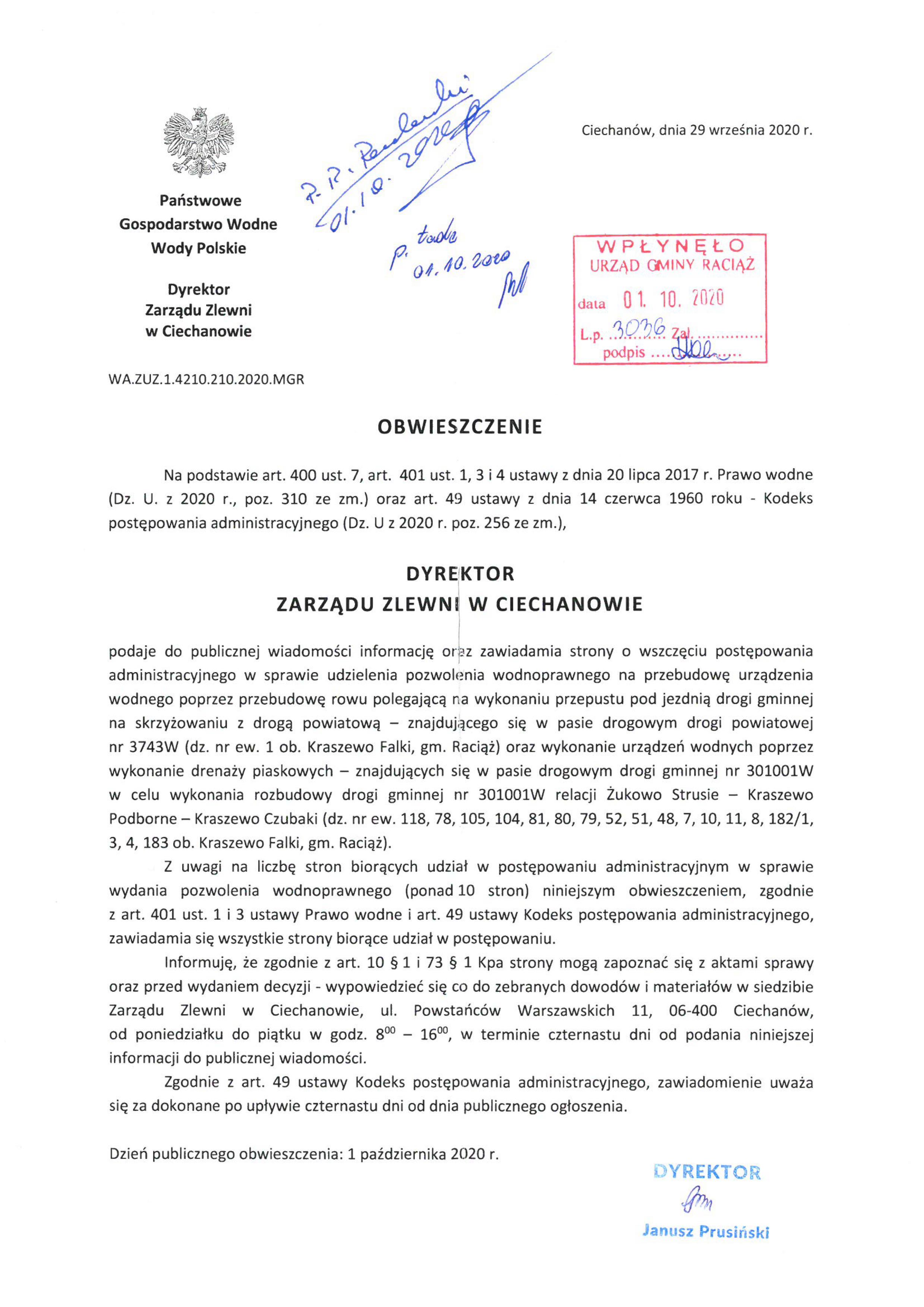 Obwieszczenie wodnoprawne - wszczęcie postępowania droga Kraszewo-Falki