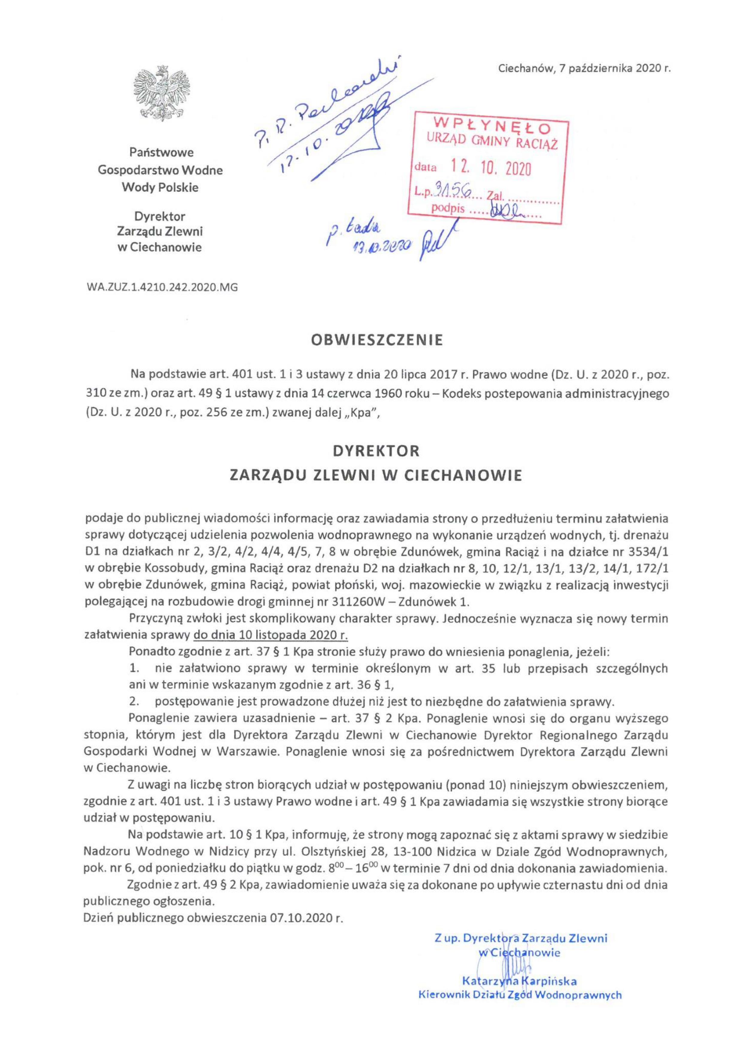 Obwieszczenie wodnoprawne - załatwienie sprawy po terminie droga Zdunówek 1