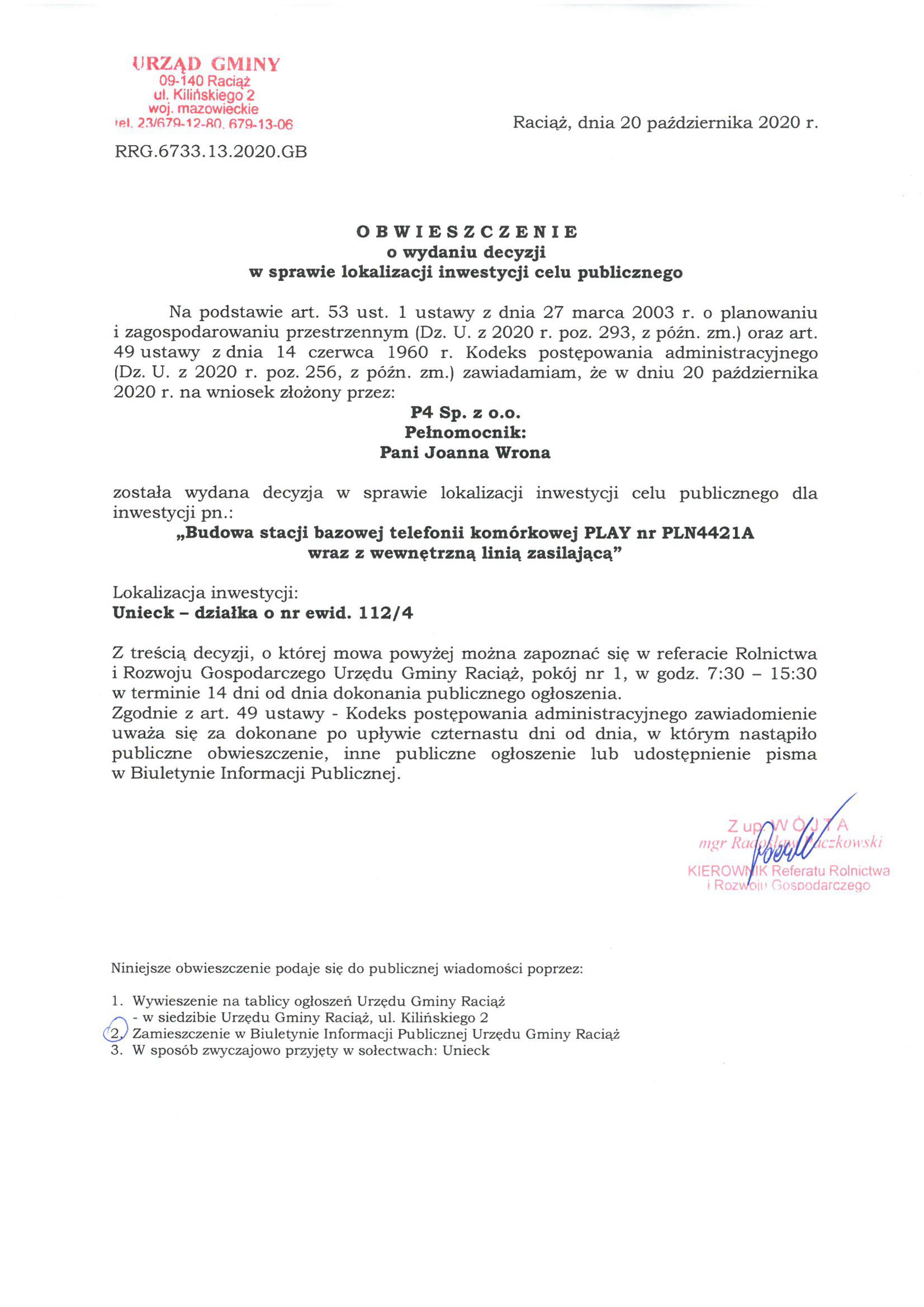 13.2020 Cel Publiczny - „Budowa stacji bazowej telefonii komórkowej PLAY nr PLN4421A wraz z wewnętrzną linią zasilającą” w miejscowości Unieck