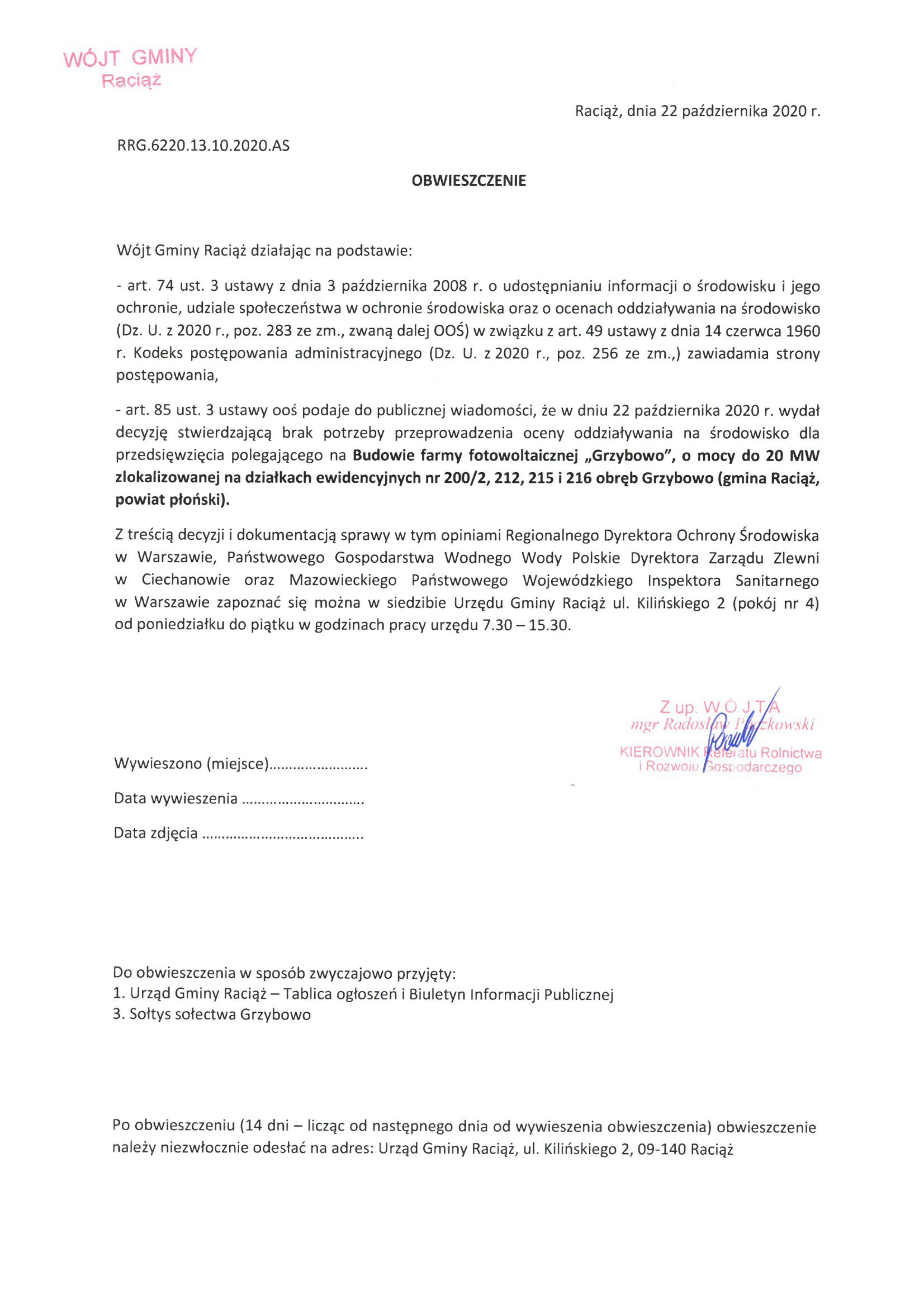 Budowa farmy fotowoltaicznej „Grzybowo”, o mocy do 20 MW zlokalizowanej na działkach ewidencyjnych nr 200/2, 212, 215 i 216 obręb Grzybowo (gmina Raciąż, powiat płoński).