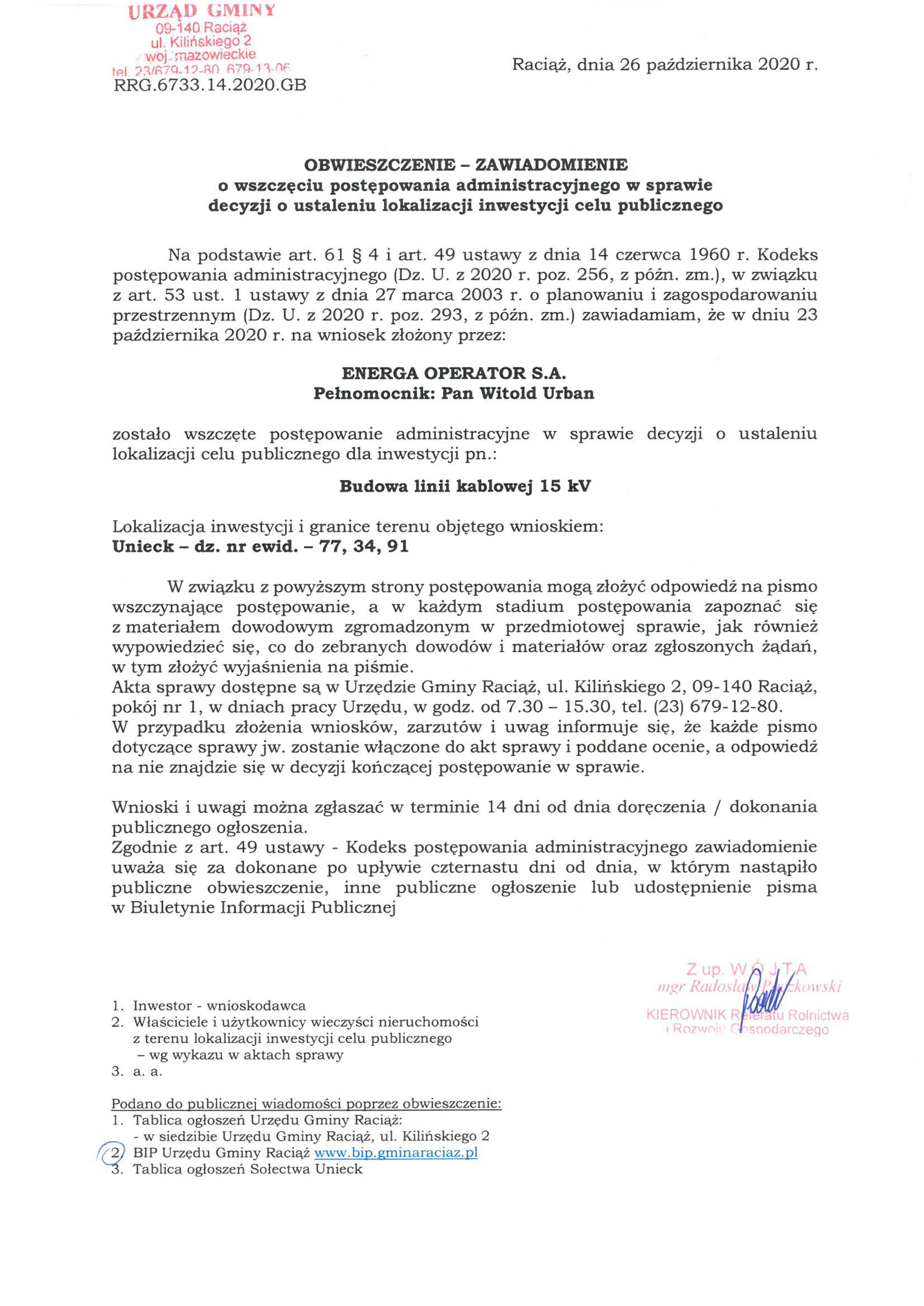 14.2020 Cel Publiczny – Obwieszczenie o wszczęciu postępowania pn. „Budowa linii kablowej 15 kV” w miejscowości Unieck