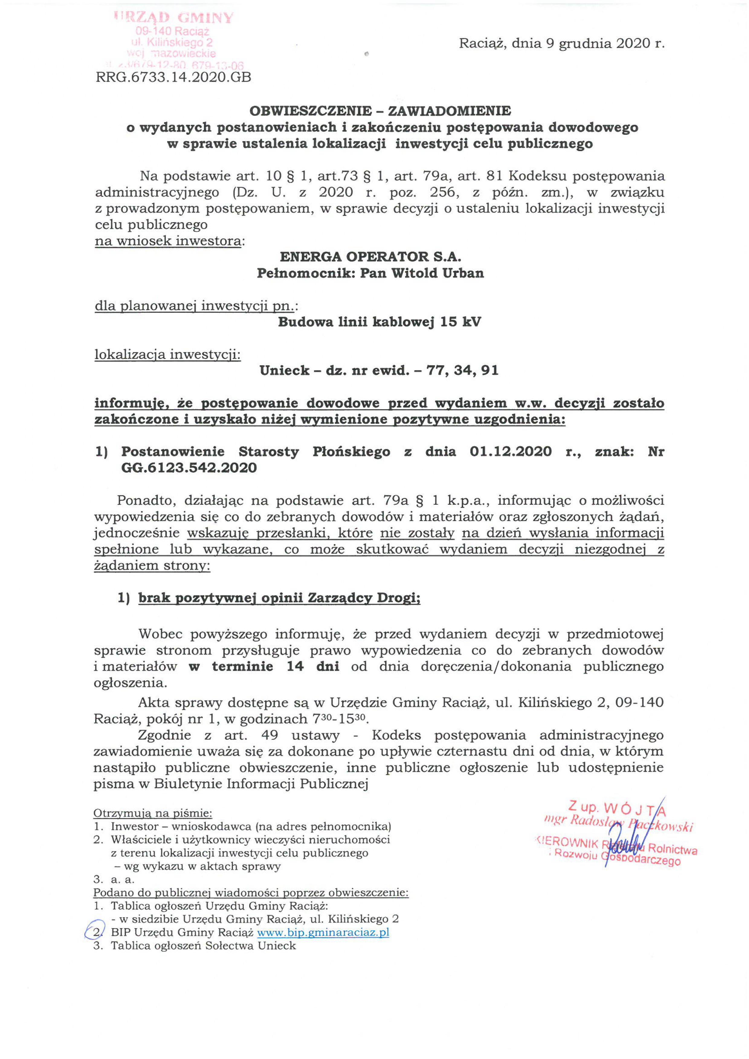 14.2020 Cel Publiczny – Obwieszczenie o wydanych postanowieniach i zakończeniu postepowania dowodowego pn. „Budowa linii kablowej 15 kV” w miejscowości Unieck
