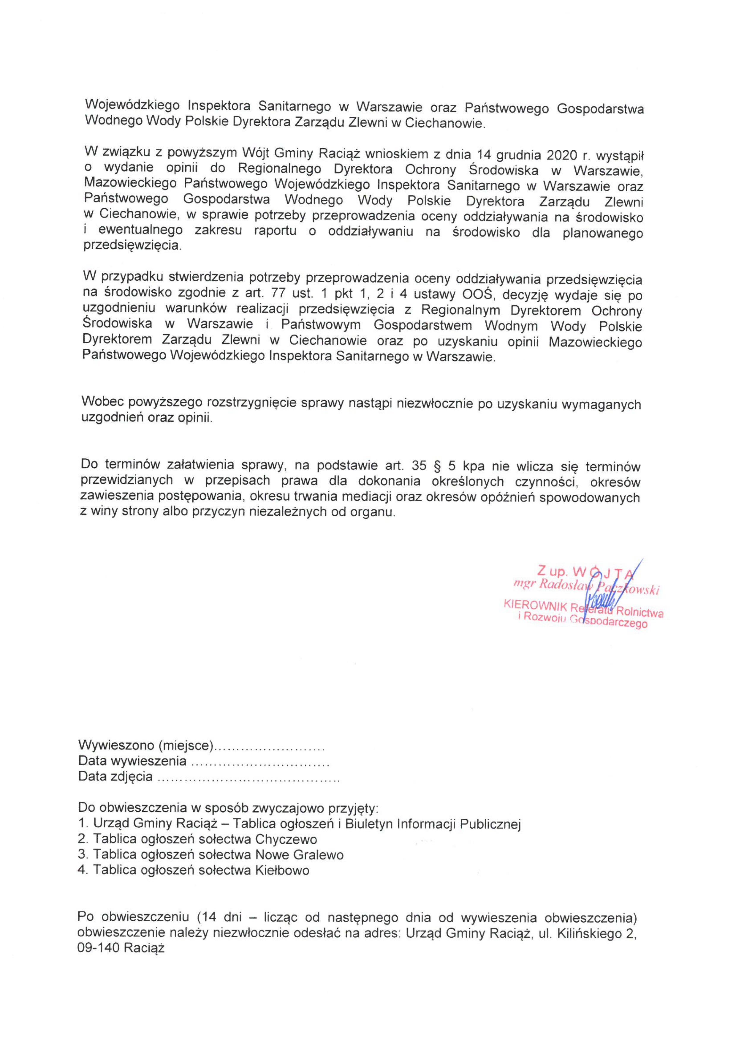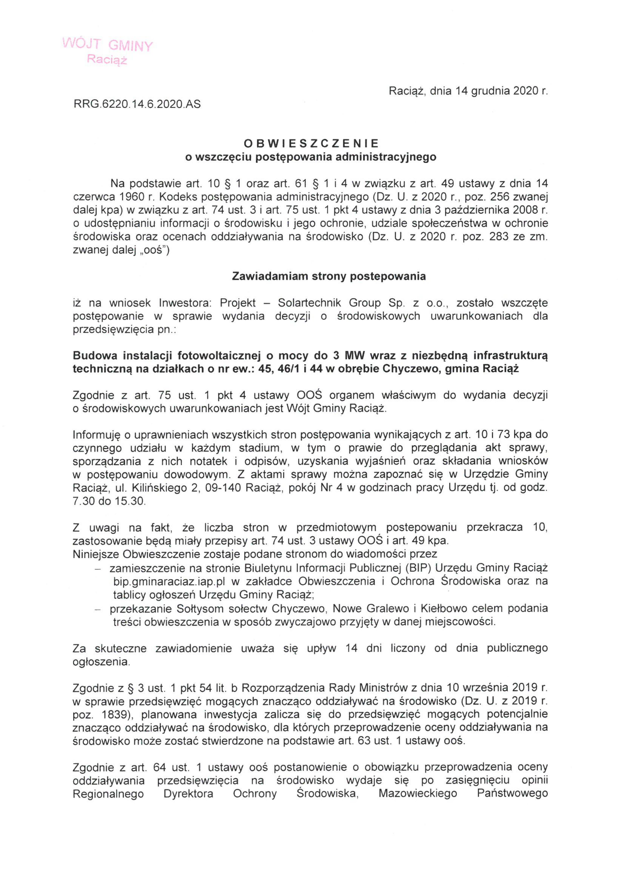 Budowa instalacji fotowoltaicznej o mocy do 3 MW wraz z niezbędną infrastrukturą techniczną na działkach o nr ew.: 45, 46/1 i 44 w obrębie Chyczewo, gmina Raciąż