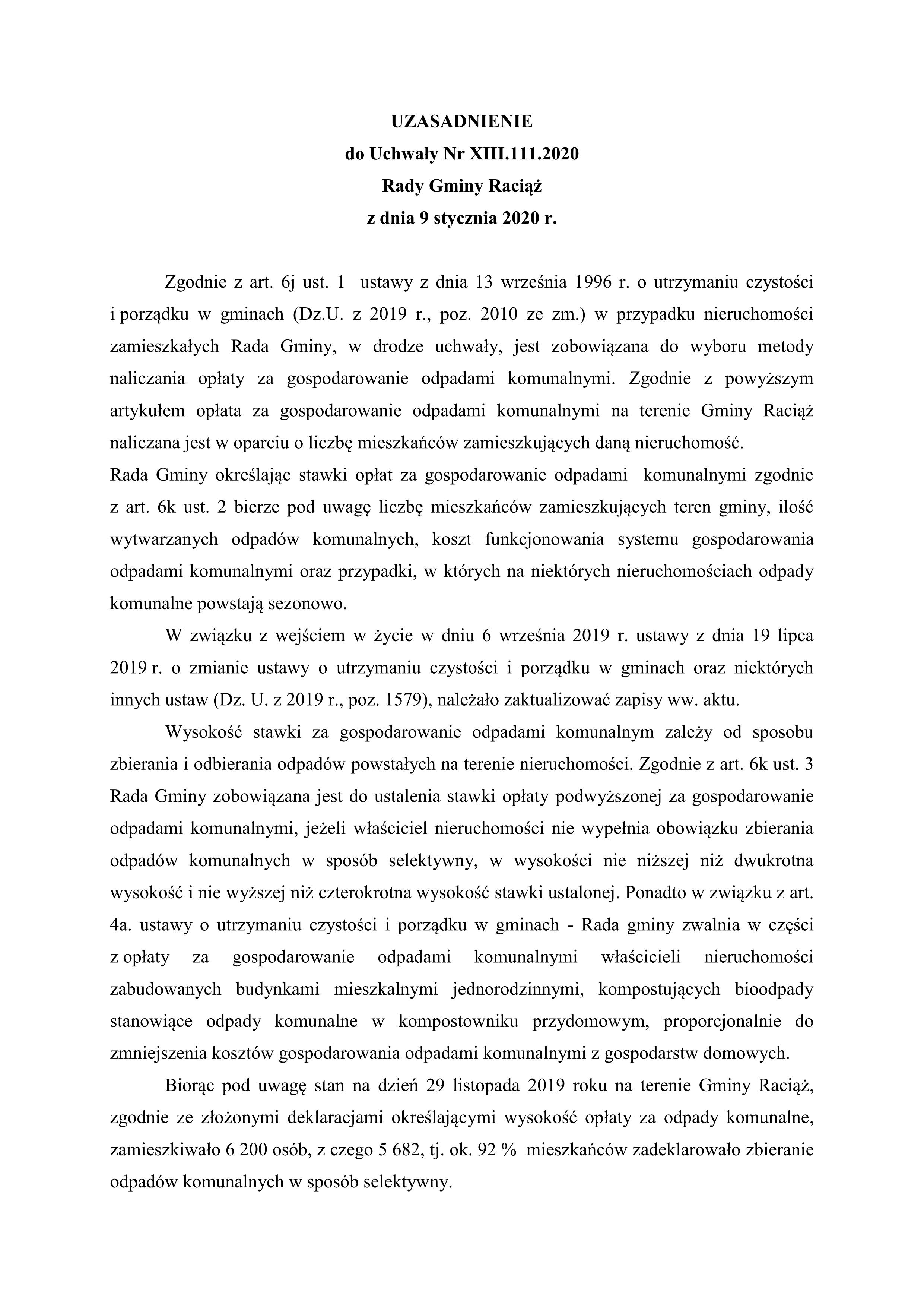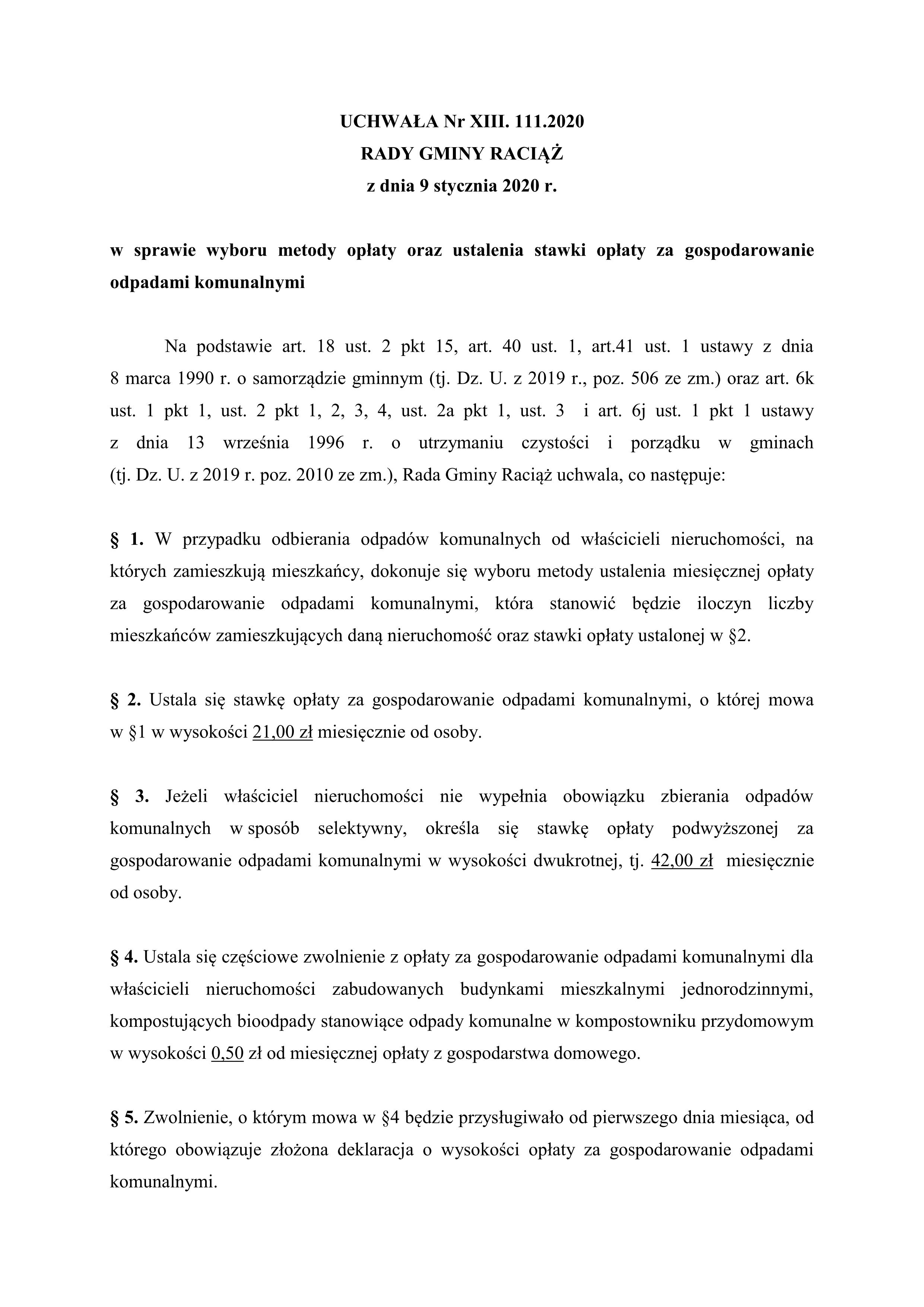 UCHWAŁA Nr XIII.111.2020 RADY GMINY RACIĄŻ z dnia 9 stycznia 2020r.